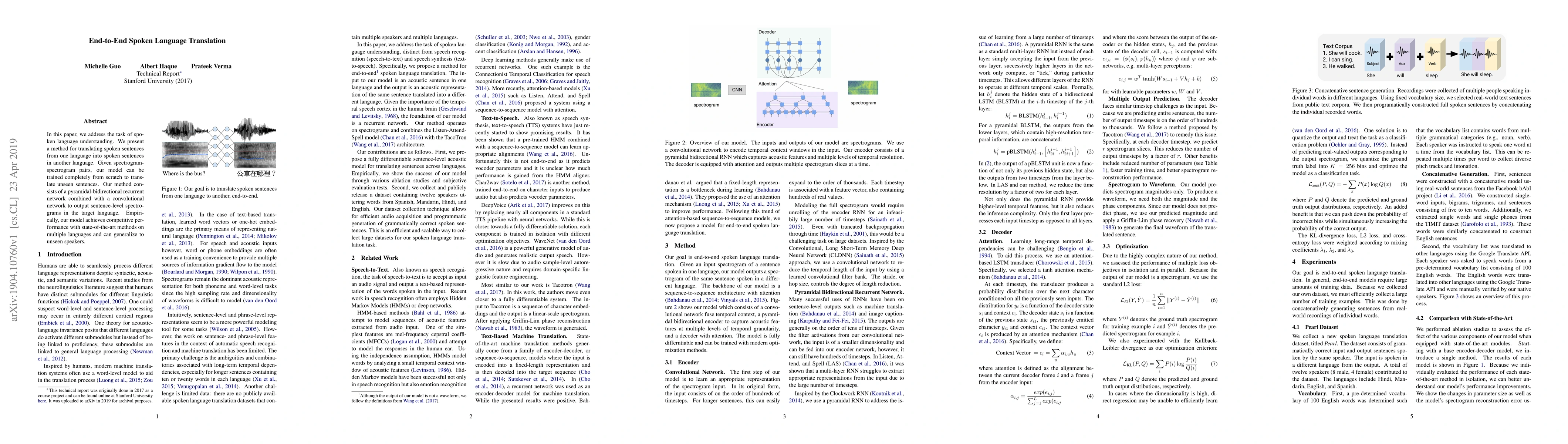 This paper introduces a method for translating spoken sentences across languages using a pyramidal-bidirectional recurrent network and convolutional network, achieving competitive performance and generalizing to unseen speakers. The model is trained from scratch using spectrogram-spectrogram pairs.