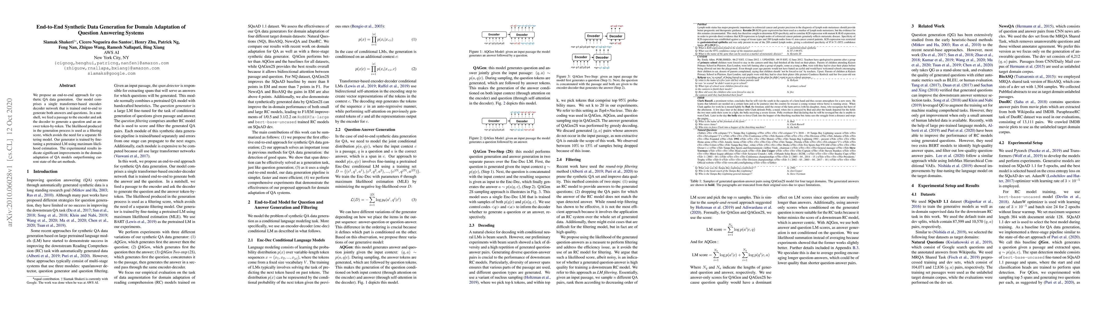 This paper proposes an end-to-end synthetic data generation method for domain adaptation in question answering systems using a transformer-based encoder-decoder network. The model generates both questions and answers from passages, with the generation likelihood used as a filtering score, leading to improved domain adaptation performance.