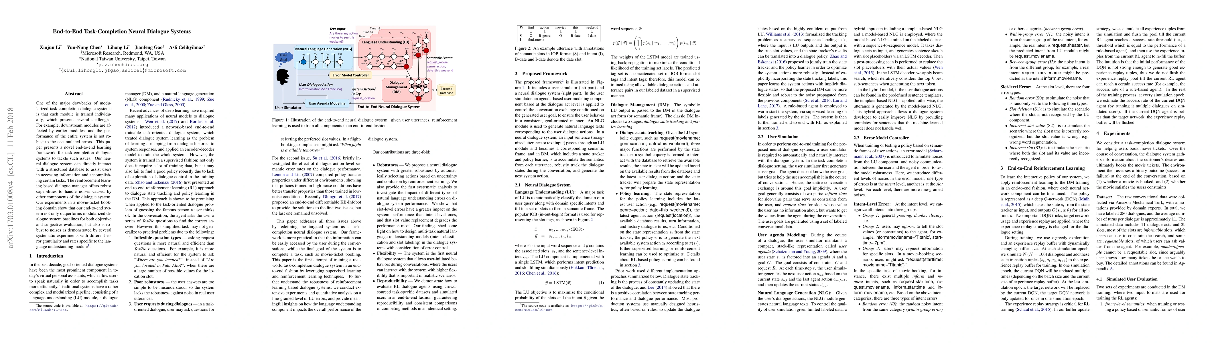 This paper introduces an end-to-end neural dialogue system framework to improve task-completion dialogue systems by addressing the limitations of modularized approaches. The proposed system demonstrates superior performance and robustness to noise compared to traditional modular systems, as evidenced by experiments in a movie-ticket booking domain.