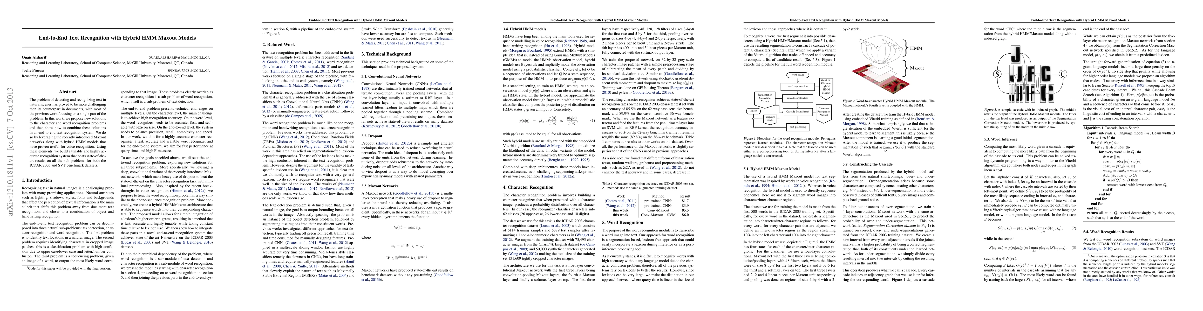 This paper proposes an end-to-end text recognition system using hybrid HMM Maxout networks, combining character and word recognition solutions to outperform state-of-the-art results on ICDAR 2003 and SVT datasets. The approach leverages Maxout networks and hybrid HMM models for improved accuracy.