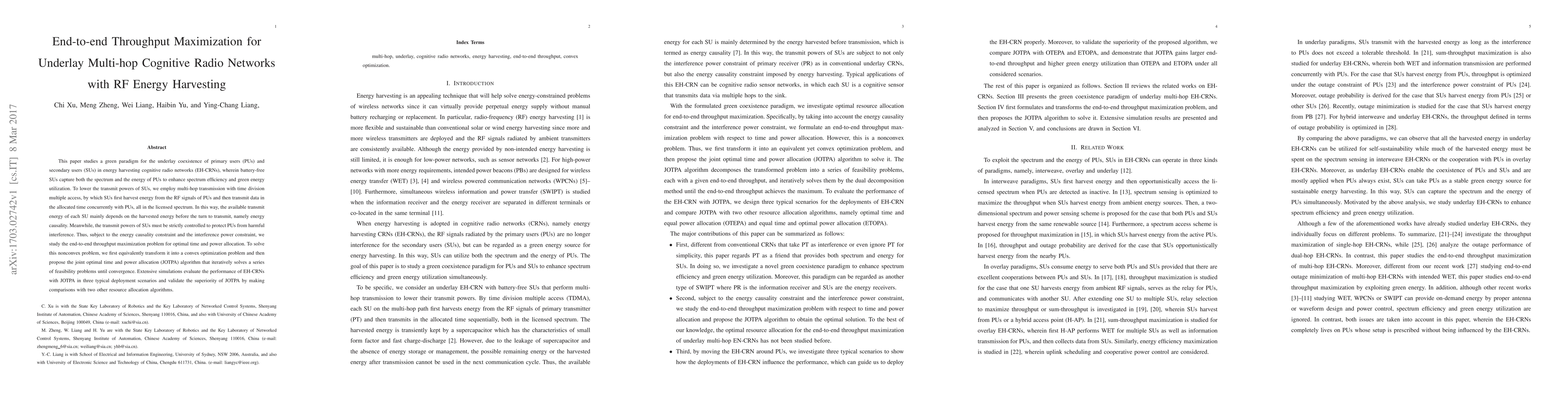 This paper explores maximizing end-to-end throughput in multi-hop cognitive radio networks with RF energy harvesting, where secondary users utilize harvested energy from primary users' signals. The proposed joint optimal time and power allocation algorithm optimizes throughput while ensuring interference protection for primary users.