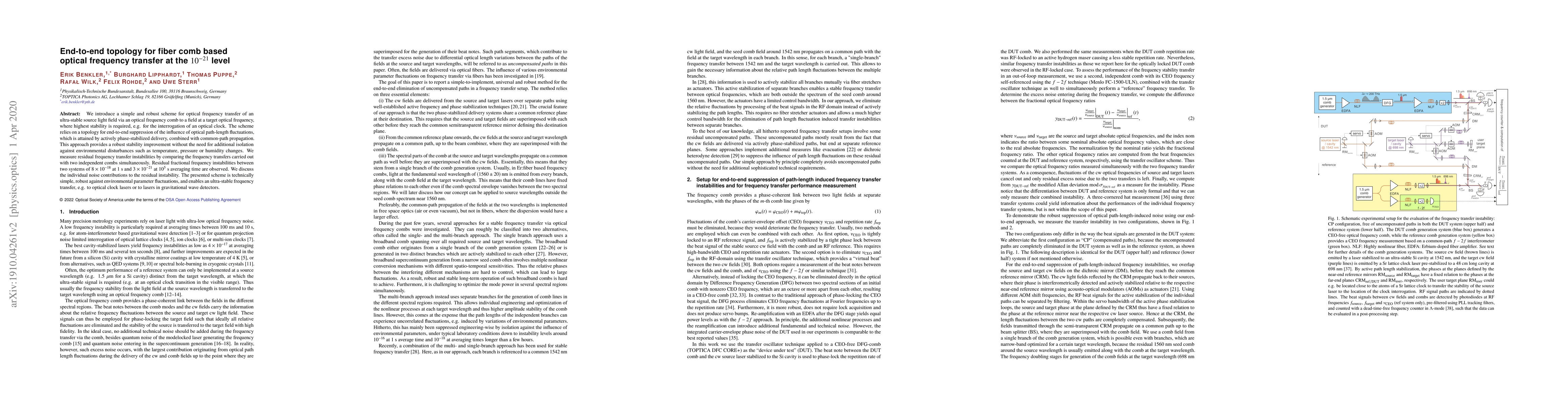 We introduce a simple and robust scheme for optical frequency transfer of an ultra-stable source light field via an optical frequency comb to a field at a target optical frequency, where highest stability is required, e.g. for the interrogation of an optical clock. The scheme relies on a topology for end-to-end suppression of the influence of optical path-length fluctuations, which is attained by actively phase-stabilized delivery, combined with common-path propagation. This approach provides a robust stability improvement without the need for additional isolation against environmental disturbances such as temperature, pressure or humidity changes. We measure residual frequency transfer instabilities by comparing the frequency transfers carried out with two independent combs simultaneously. Residual fractional frequency instabilities between two systems of $8\times10^{-18}$ at 1 s and $3\times10^{-21}$ at $10^5$ s averaging time are observed. We discuss the individual noise contributions to the residual instability. The presented scheme is technically simple, robust against environmental parameter fluctuations, and enables an ultra-stable frequency transfer, e.g. to optical clock lasers or to lasers in gravitational wave detectors.