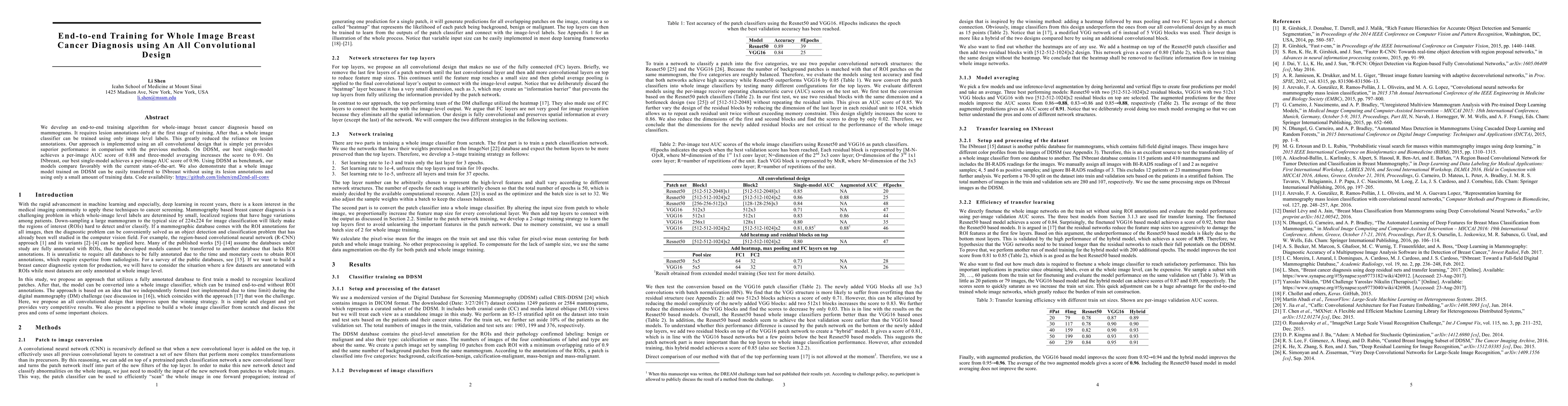 This paper presents an end-to-end training algorithm for breast cancer diagnosis using whole-image mammograms with an all convolutional network design. The method achieves high performance with minimal reliance on lesion annotations, outperforming previous methods on DDSM and INbreast datasets.
