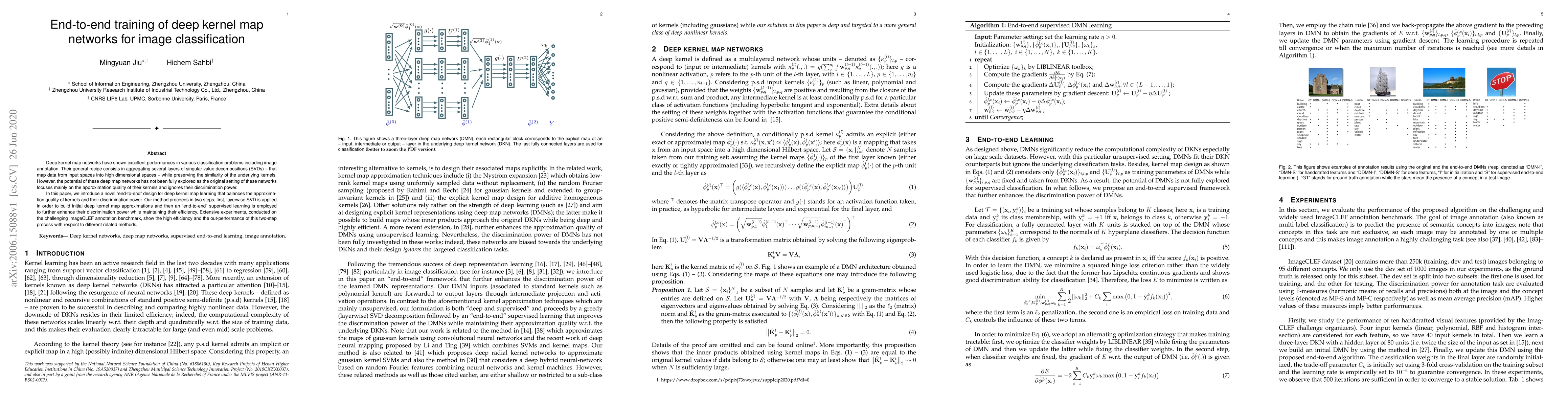 Deep kernel map networks have shown excellent performances in various classification problems including image annotation. Their general recipe consists in aggregating several layers of singular value decompositions (SVDs) -- that map data from input spaces into high dimensional spaces -- while preserving the similarity of the underlying kernels. However, the potential of these deep map networks has not been fully explored as the original setting of these networks focuses mainly on the approximation quality of their kernels and ignores their discrimination power. In this paper, we introduce a novel "end-to-end" design for deep kernel map learning that balances the approximation quality of kernels and their discrimination power. Our method proceeds in two steps; first, layerwise SVD is applied in order to build initial deep kernel map approximations and then an "end-to-end" supervised learning is employed to further enhance their discrimination power while maintaining their efficiency. Extensive experiments, conducted on the challenging ImageCLEF annotation benchmark, show the high efficiency and the out-performance of this two-step process with respect to different related methods.