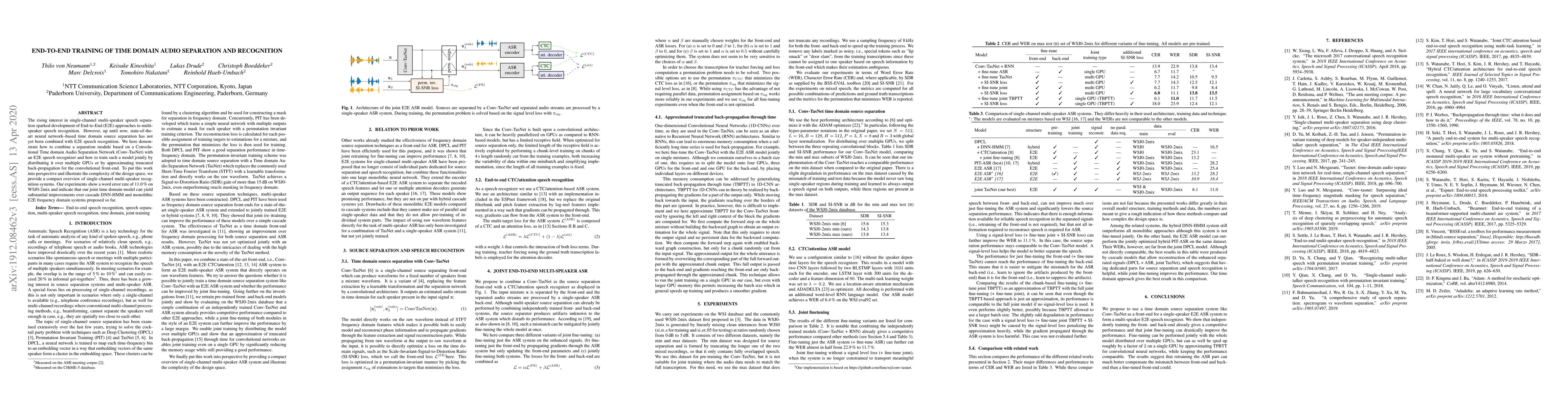 This paper presents an end-to-end model combining Convolutional Time domain Audio Separation Network (Conv-TasNet) for time domain audio separation with an E2E speech recognizer, achieving a 11.0% word error rate on WSJ0-2mix, demonstrating significant improvements over existing cascade and monolithic approaches.