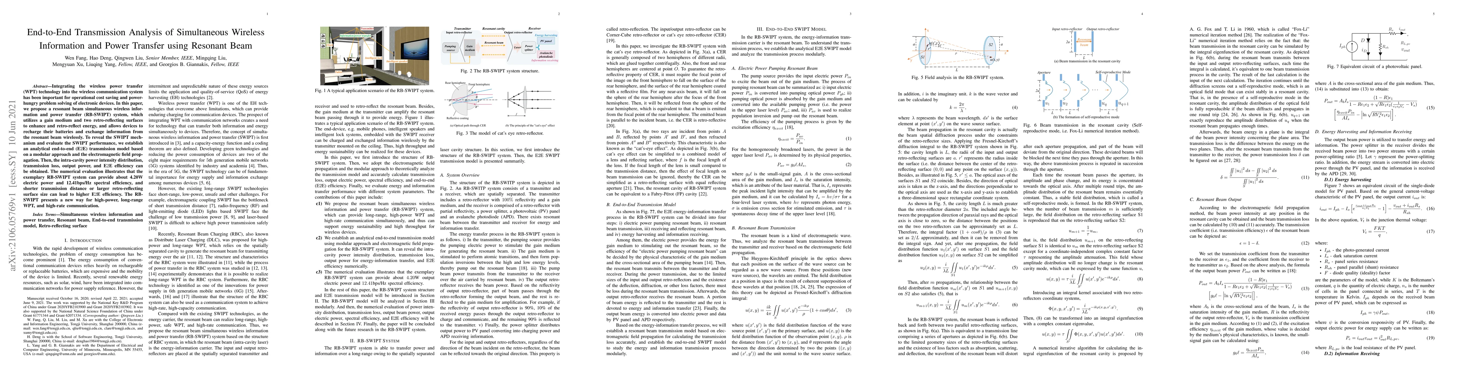 Integrating the wireless power transfer (WPT) technology into the wireless communication system has been important for operational cost saving and power-hungry problem solving of electronic devices. In this paper, we propose a resonant beam simultaneous wireless information and power transfer (RB-SWIPT) system, which utilizes a gain medium and two retro-reflecting surfaces to enhance and retro-reflect energy, and allows devices to recharge their batteries and exchange information from the resonant beam wirelessly. To reveal the SWIPT mechanism and evaluate the SWIPT performance, we establish an analytical end-to-end (E2E) transmission model based on a modular approach and the electromagnetic field propagation. Then, the intra-cavity power intensity distribution, transmission loss, output power, and E2E efficiency can be obtained. The numerical evaluation illustrates that the exemplary RB-SWIPT system can provide about 4.20W electric power and 12.41bps/Hz spectral efficiency, and shorter transmission distance or larger retro-reflecting surface size can lead to higher E2E efficiency. The RB-SWIPT presents a new way for high-power, long-range WPT, and high-rate communication.