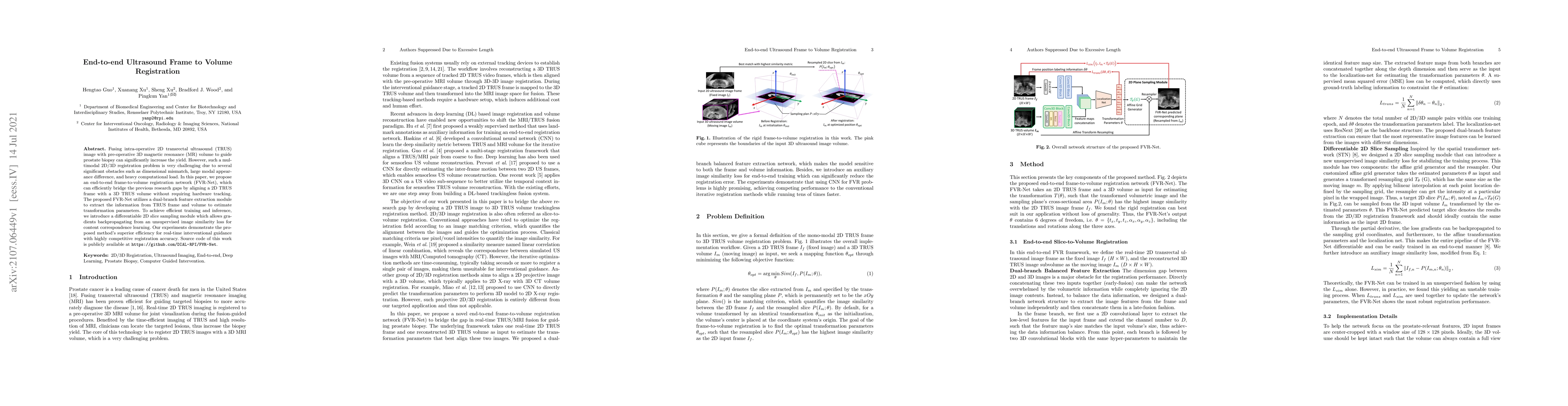 This paper introduces FVR-Net, an end-to-end network for registering 2D transrectal ultrasound (TRUS) frames with pre-operative 3D MR volumes to enhance prostate biopsy guidance. The network efficiently aligns images using a dual-branch feature extraction and a differentiable slice sampling module, achieving real-time registration with high accuracy.