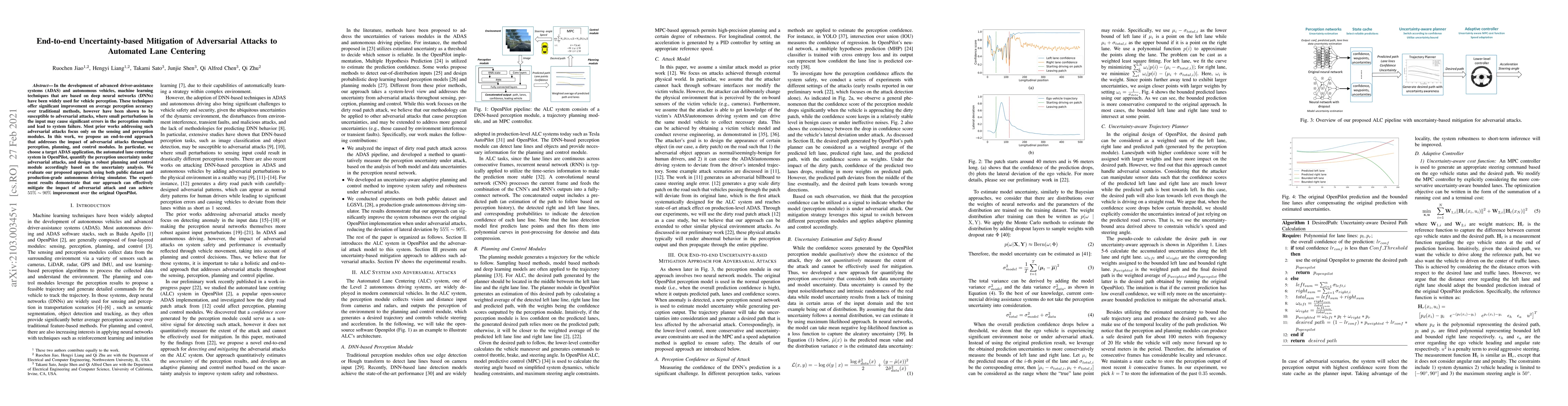 In the development of advanced driver-assistance systems (ADAS) and autonomous vehicles, machine learning techniques that are based on deep neural networks (DNNs) have been widely used for vehicle perception. These techniques offer significant improvement on average perception accuracy over traditional methods, however, have been shown to be susceptible to adversarial attacks, where small perturbations in the input may cause significant errors in the perception results and lead to system failure. Most prior works addressing such adversarial attacks focus only on the sensing and perception modules. In this work, we propose an end-to-end approach that addresses the impact of adversarial attacks throughout perception, planning, and control modules. In particular, we choose a target ADAS application, the automated lane centering system in OpenPilot, quantify the perception uncertainty under adversarial attacks, and design a robust planning and control module accordingly based on the uncertainty analysis. We evaluate our proposed approach using both the public dataset and production-grade autonomous driving simulator. The experiment results demonstrate that our approach can effectively mitigate the impact of adversarial attacks and can achieve 55% to 90% improvement over the original OpenPilot.