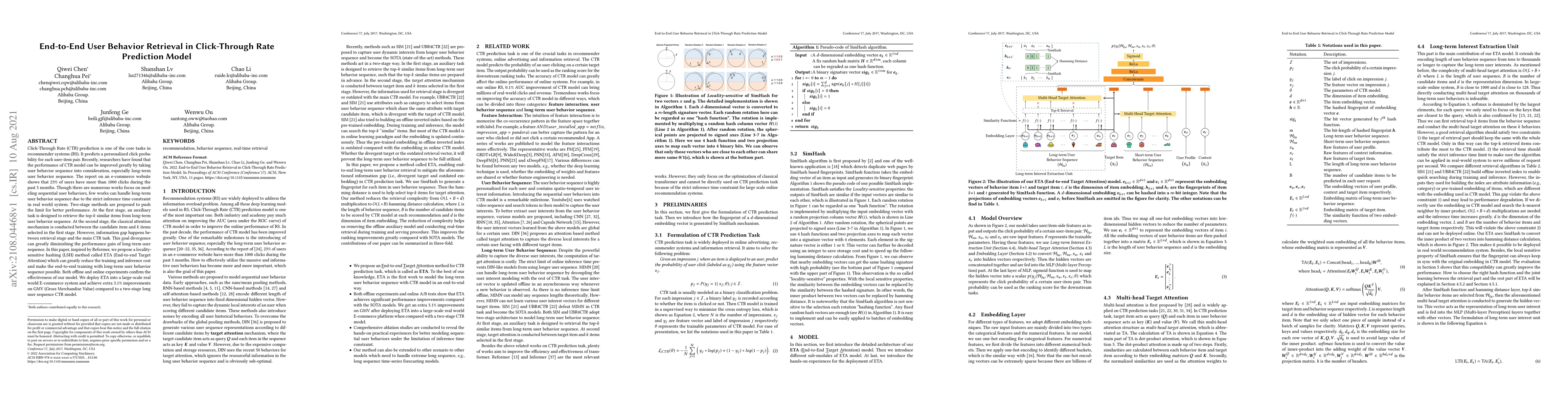This paper proposes a new method called ETA for end-to-end user behavior retrieval in click-through rate prediction models, improving performance with long-term user sequences without sacrificing inference time.