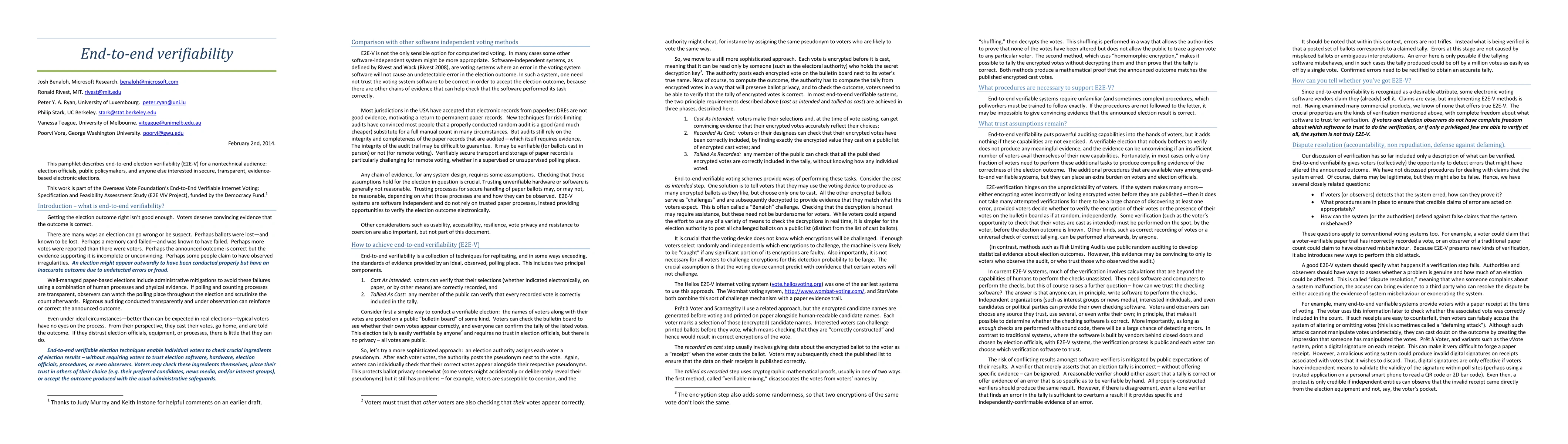 This pamphlet describes end-to-end election verifiability (E2E-V) for a nontechnical audience: election officials, public policymakers, and anyone else interested in secure, transparent, evidence-based electronic elections. This work is part of the Overseas Vote Foundation's End-to-End Verifiable Internet Voting: Specification and Feasibility Assessment Study (E2E VIV Project), funded by the Democracy Fund.
