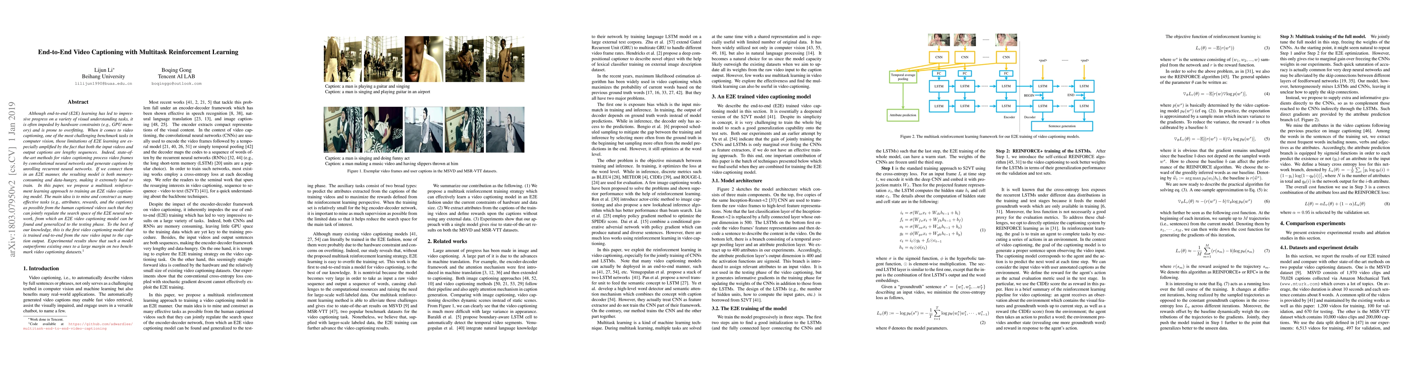 This paper proposes a multitask reinforcement learning approach for end-to-end video captioning, addressing the challenges of hardware constraints and overfitting. The method leverages various constructed tasks to regulate the neural network's search space, leading to a model that outperforms existing methods on benchmark datasets.