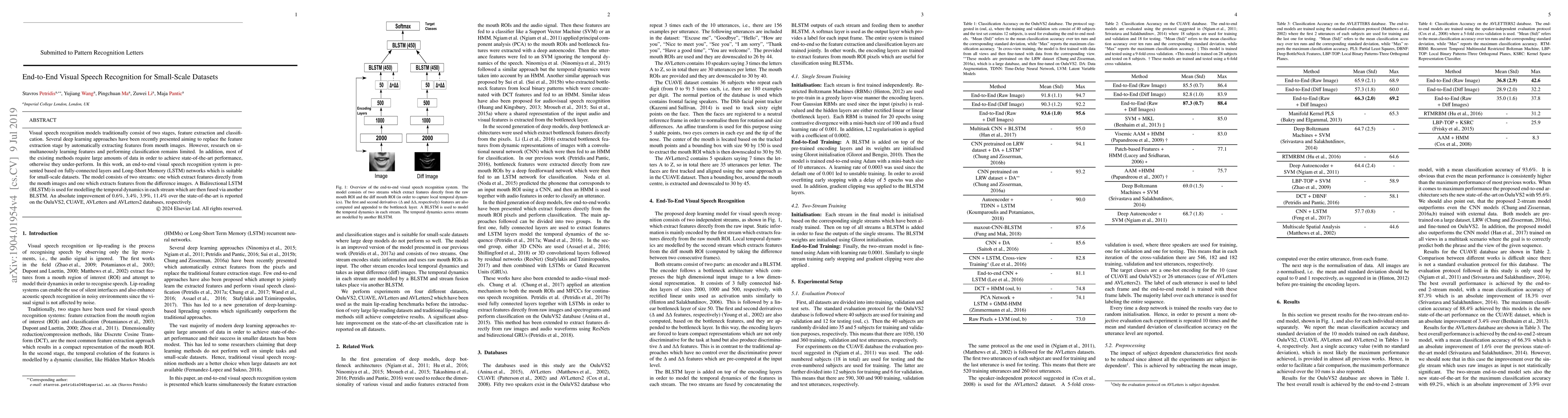 Visual speech recognition models traditionally consist of two stages, feature extraction and classification. Several deep learning approaches have been recently presented aiming to replace the feature extraction stage by automatically extracting features from mouth images. However, research on joint learning of features and classification remains limited. In addition, most of the existing methods require large amounts of data in order to achieve state-of-the-art performance, otherwise they under-perform. In this work, we present an end-to-end visual speech recognition system based on fully-connected layers and Long-Short Memory (LSTM) networks which is suitable for small-scale datasets. The model consists of two streams which extract features directly from the mouth and difference images, respectively. The temporal dynamics in each stream are modelled by a Bidirectional LSTM (BLSTM) and the fusion of the two streams takes place via another BLSTM. An absolute improvement of 0.6%, 3.4%, 3.9%, 11.4% over the state-of-the-art is reported on the OuluVS2, CUAVE, AVLetters and AVLetters2 databases, respectively.