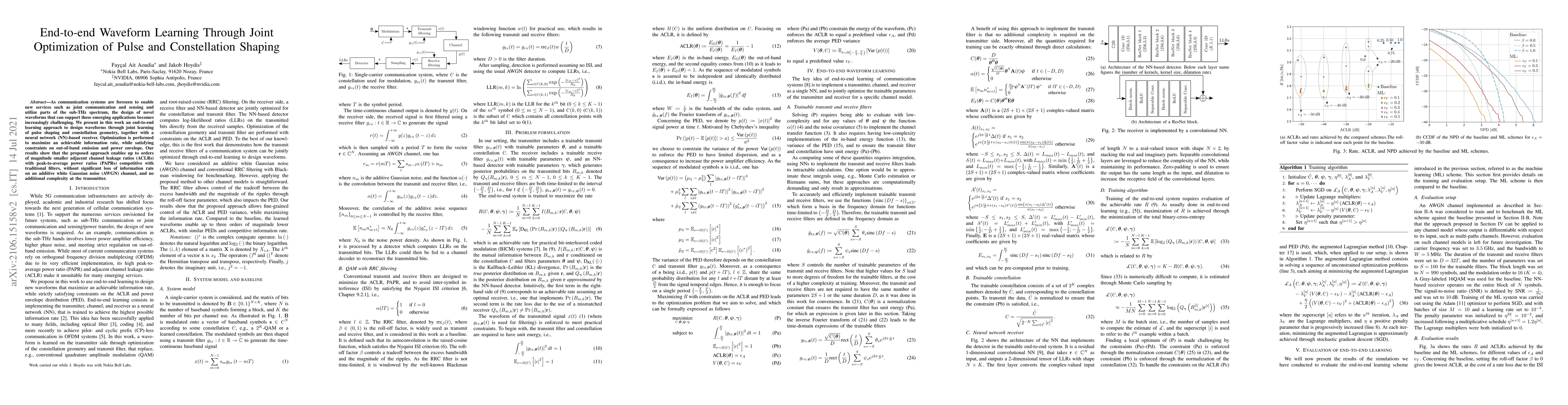 This paper proposes an end-to-end learning method for designing novel waveforms by jointly optimizing pulse shaping and constellation geometry, achieving significantly lower adjacent channel leakage ratios and competitive peak-to-average power ratios, while maintaining information rate on an AWGN channel.