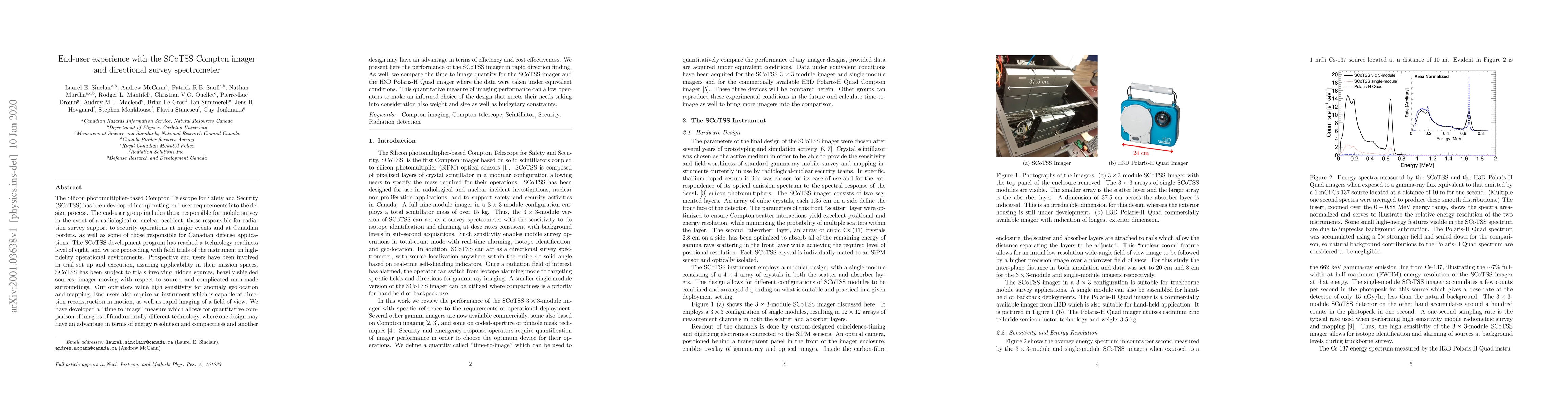 The Silicon photomultiplier-based Compton Telescope for Safety and Security (SCoTSS) has been developed incorporating end-user requirements into the design process. The end-user group includes those responsible for mobile survey in the event of a radiological or nuclear accident, those responsible for radiation survey support to security operations at major events and at Canadian borders, as well as some of those responsible for Canadian defense applications. The SCoTSS development program has reached a technology readiness level of eight, and we are proceeding with field trials of the instrument in high-fidelity operational environments. Prospective end users have been involved in trial set up and execution, assuring applicability in their mission spaces. SCoTSS has been subject to trials involving hidden sources, heavily shielded sources, imager moving with respect to source, and complicated man-made surroundings. Our operators value high sensitivity for anomaly geolocation and mapping. End users also require an instrument which is capable of direction reconstruction in motion, as well as rapid imaging of a field of view. We have developed a "time to image" measure which allows for quantitative comparison of imagers of fundamentally different technology, where one design may have an advantage in terms of energy resolution and compactness and another design may have an advantage in terms of efficiency and cost effectiveness. We present here the performance of the SCoTSS imager in rapid direction finding. As well, we compare the time to image quantity for the SCoTSS imager and the H3D Polaris-H Quad imager where the data were taken under equivalent conditions. This quantitative measure of imaging performance can allow operators to make an informed choice of the design that meets their needs taking into consideration also weight and size as well as budgetary constraints.
