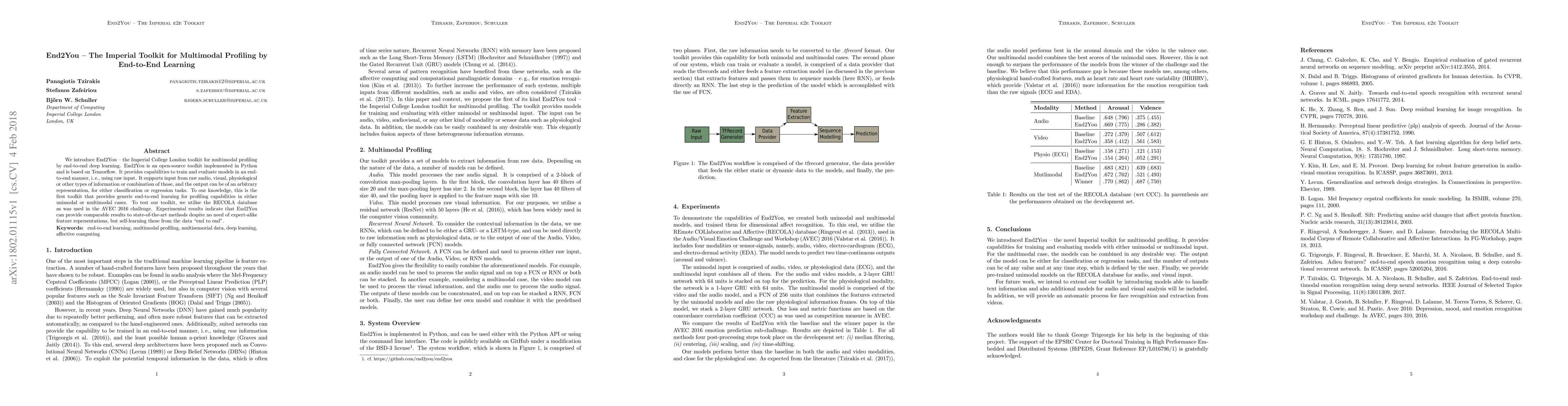 End2You is an open-source toolkit for multimodal profiling using end-to-end deep learning, supporting diverse input types and arbitrary output representations. Experimental results show it can achieve state-of-the-art performance without relying on expert-crafted features.