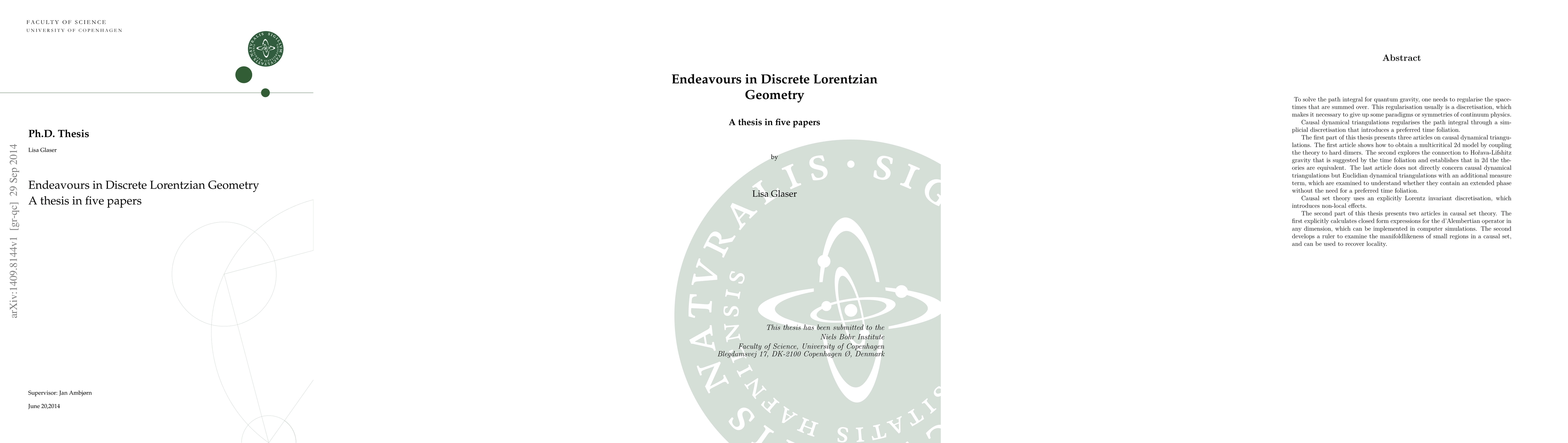 To solve the path integral for quantum gravity, one needs to regularise the space-times that are summed over. This regularisation usually is a discretisation, which makes it necessary to give up some paradigms or symmetries of continuum physics. Causal dynamical triangulations regularises the path integral through a simplicial discretisation that introduces a preferred time foliation. The first part of this thesis presents three articles on causal dynamical triangulations. The first article shows how to obtain a multicritical 2d model by coupling the theory to hard dimers. The second explores the connection to Ho\v{r}ava-Lifshitz gravity that is suggested by the time foliation and establishes that in 2d the theories are equivalent. The last article does not directly concern causal dynamical triangulations but Euclidian dynamical triangulations with an additional measure term, which are examined to understand whether they contain an extended phase without the need for a preferred time foliation. Causal set theory uses an explicitly Lorentz invariant discretisation, which introduces non-local effects. The second part of this thesis presents two articles in causal set theory. The first explicitly calculates closed form expressions for the d'Alembertian operator in any dimension, which can be implemented in computer simulations. The second develops a ruler to examine the manifoldlikeness of small regions in a causal set, and can be used to recover locality.