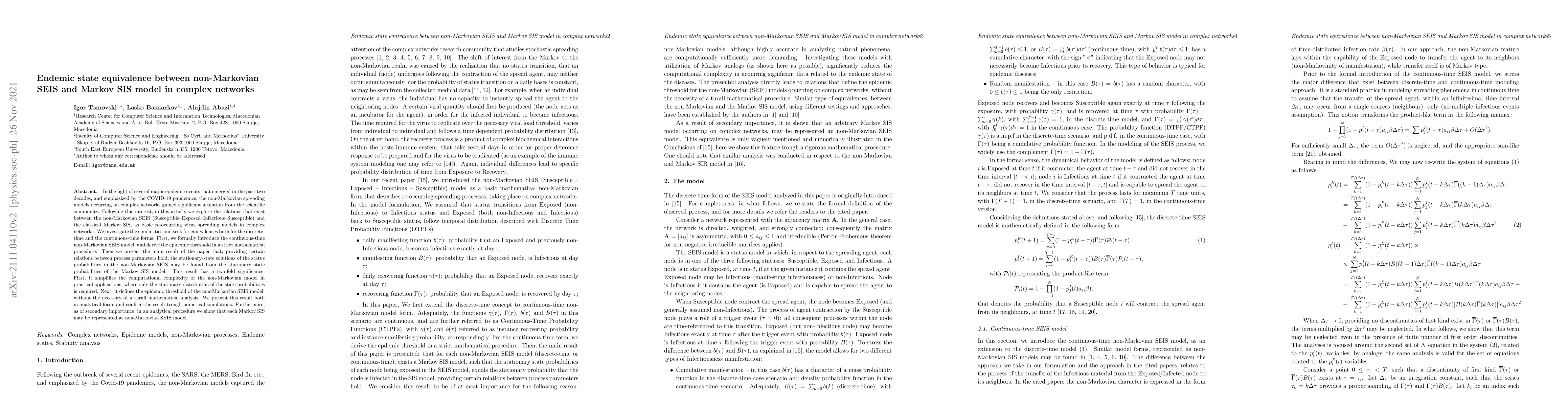 This paper explores the equivalence between non-Markovian SEIS and Markov SIS models in complex networks, demonstrating that under certain conditions, the stationary state probabilities of the non-Markovian SEIS can be derived from those of the Markov SIS, simplifying computational complexity and defining the epidemic threshold without extensive mathematical analysis.