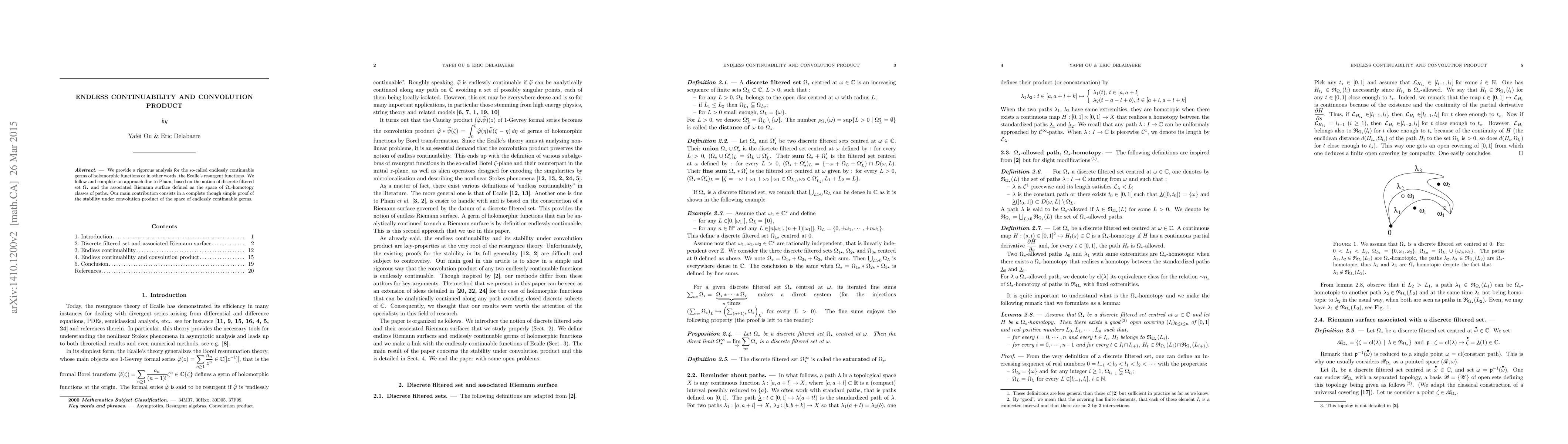 We provide a rigorous analysis for the so-called endlessly continuable germs of holomorphic functions or in other words, the Ecalle's resurgent functions. We follow and complete an approach due to Pham, based on the notion of discrete filtered set and the associated Riemann surface defined as the space of convenient homotopy classes of paths. Our main contribution consists in a complete though simple proof of the stability under convolution product of the space of endlessly continuable germs.