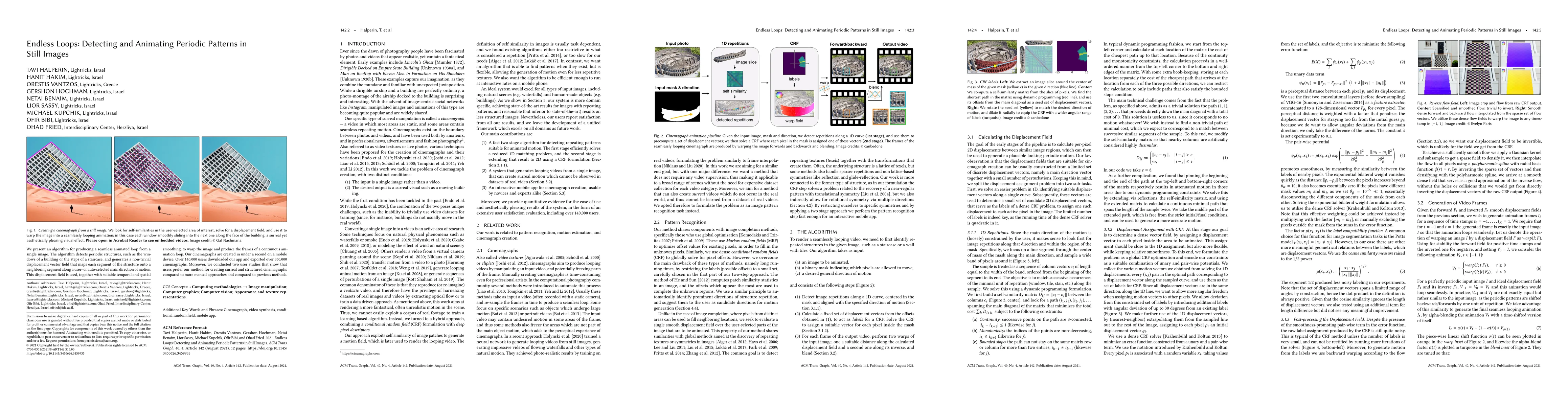 We present an algorithm for producing a seamless animated loop from a single image. The algorithm detects periodic structures, such as the windows of a building or the steps of a staircase, and generates a non-trivial displacement vector field that maps each segment of the structure onto a neighboring segment along a user- or auto-selected main direction of motion. This displacement field is used, together with suitable temporal and spatial smoothing, to warp the image and produce the frames of a continuous animation loop. Our cinemagraphs are created in under a second on a mobile device. Over 140,000 users downloaded our app and exported over 350,000 cinemagraphs. Moreover, we conducted two user studies that show that users prefer our method for creating surreal and structured cinemagraphs compared to more manual approaches and compared to previous methods.