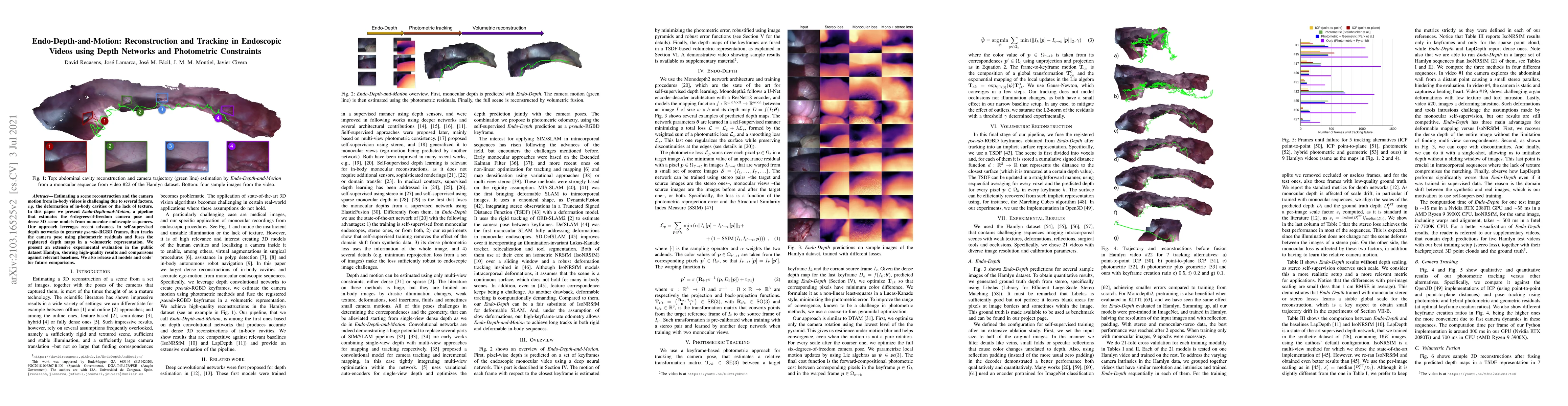 This paper introduces Endo-Depth-and-Motion, a method for reconstructing 3D scenes and tracking camera motion in monocular endoscopic videos using self-supervised depth networks and photometric constraints. The approach generates pseudo-RGBD frames and tracks camera pose, achieving high-quality results as demonstrated in the Hamlyn dataset.