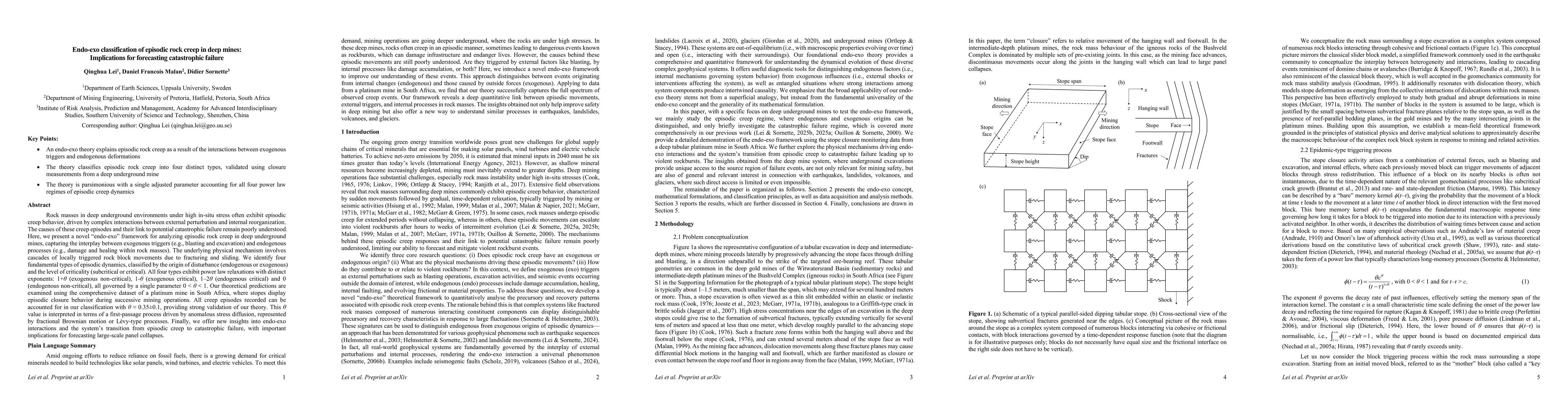 Rock masses in deep underground environments under high in-situ stress often exhibit episodic creep behavior, driven by complex interactions between external perturbation and internal reorganization. The causes of these creep episodes and their link to potential catastrophic failure remain poorly understood. Here, we present a novel 'endo-exo' framework for analyzing episodic rock creep in deep underground mines, capturing the interplay between exogenous triggers (e.g., blasting and excavation) and endogenous processes (e.g., damage and healing within rock masses). The underlying physical mechanism involves cascades of locally triggered rock block movements due to fracturing and sliding. We identify four fundamental types of episodic dynamics, classified by the origin of disturbance (endogenous or exogenous) and the level of criticality (subcritical or critical). All four types exhibit power law relaxations with distinct exponents: 1+\theta (exogenous subcritical), 1-\theta (exogenous critical), 1-2\theta (endogenous critical) and 0 (endogenous subcritical), all governed by a single parameter 0 < \theta < 1. Our theoretical predictions are examined using the comprehensive dataset of a platinum mine in South Africa, where stopes display episodic closure behavior during successive mining operations. All creep episodes recorded can be accounted for in our classification with \theta \approx 0.35\pm0.1, providing strong validation of our theory. This \theta value is interpreted in terms of a first-passage process driven by anomalous stress diffusion, represented by fractional Brownian motion or L\'{e}vy-type processes. Finally, we offer new insights into endo-exo interactions and the system's transition from episodic creep to catastrophic failure, with important implications for forecasting large-scale panel collapses.