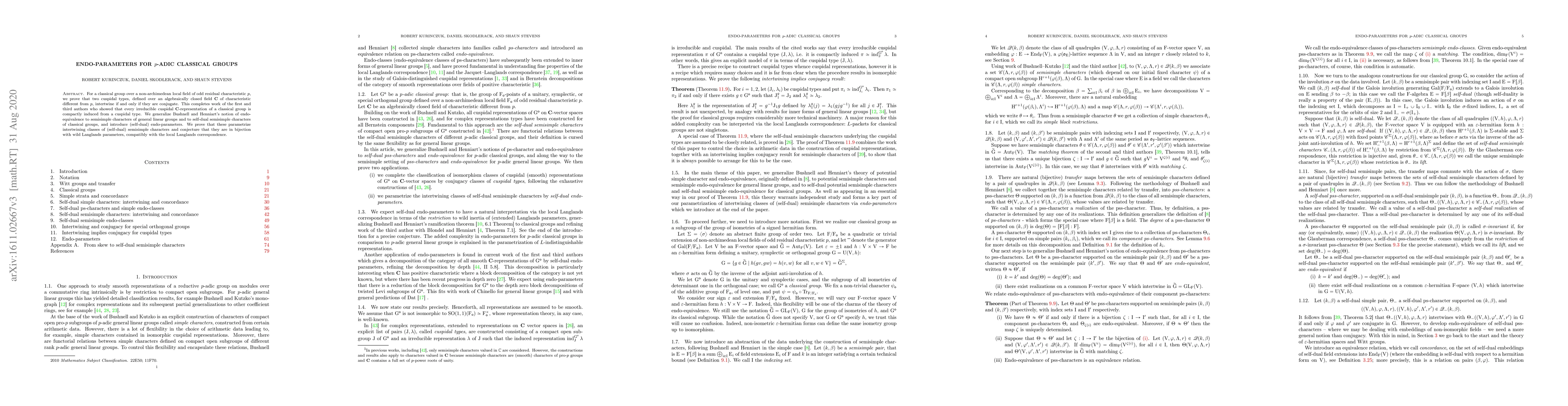 For a classical group over a non-archimedean local field of odd residual characteristic p, we prove that two cuspidal types, defined over an algebraically closed field C of characteristic different from p, intertwine if and only if they are conjugate. This completes work of the first and third authors who showed that every irreducible cuspidal C-representation of a classical group is compactly induced from a cuspidal type. We generalize Bushnell and Henniart's notion of endo-equivalence to semisimple characters of general linear groups and to self-dual semisimple characters of classical groups, and introduce (self-dual) endo-parameters. We prove that these parametrize intertwining classes of (self-dual) semisimple characters and conjecture that they are in bijection with wild Langlands parameters, compatibly with the local Langlands correspondence.