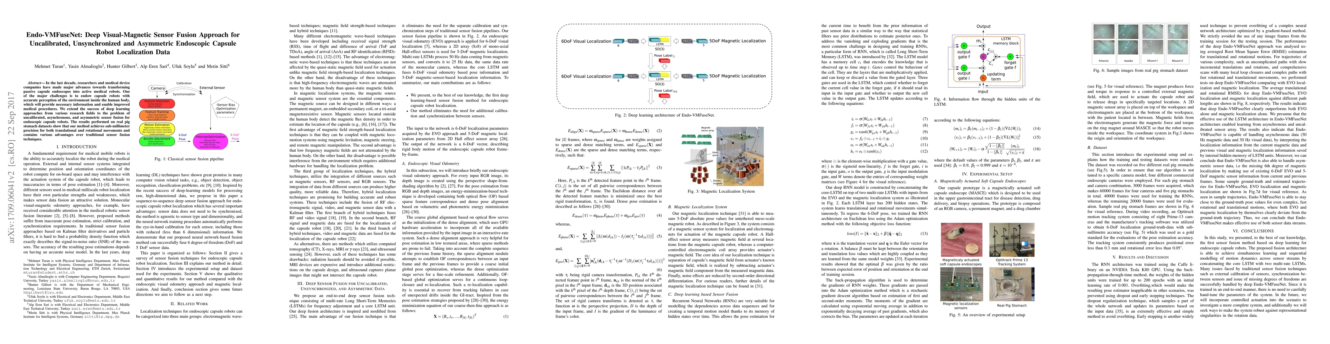 Summary: This paper proposes Endo-VMFuseNet, a deep learning-based approach for fusing visual and magnetic sensors to localize uncalibrated, unsynchronized endoscopic capsule robots with sub-millimeter precision. The method outperforms traditional sensor fusion techniques, demonstrated through real pig stomach data.