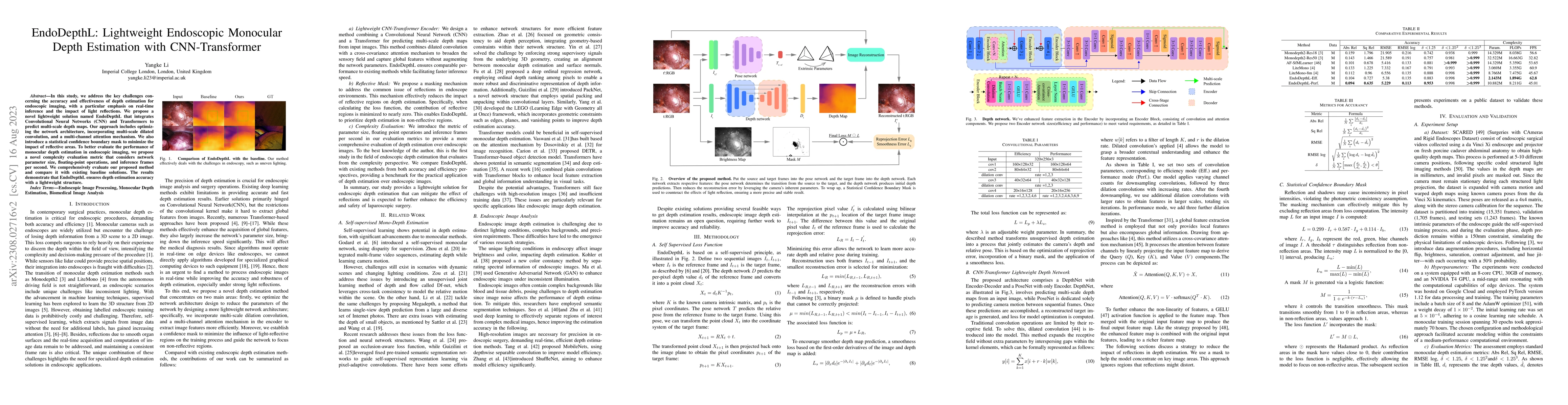 This paper proposes EndoDepthL, a lightweight solution for real-time monocular depth estimation in endoscopic imaging using a CNN-Transformer architecture. The method optimizes the network with multi-scale dilated convolutions and attention mechanisms, and introduces a confidence mask to handle light reflections, achieving accurate depth estimation with a novel complexity evaluation metric.