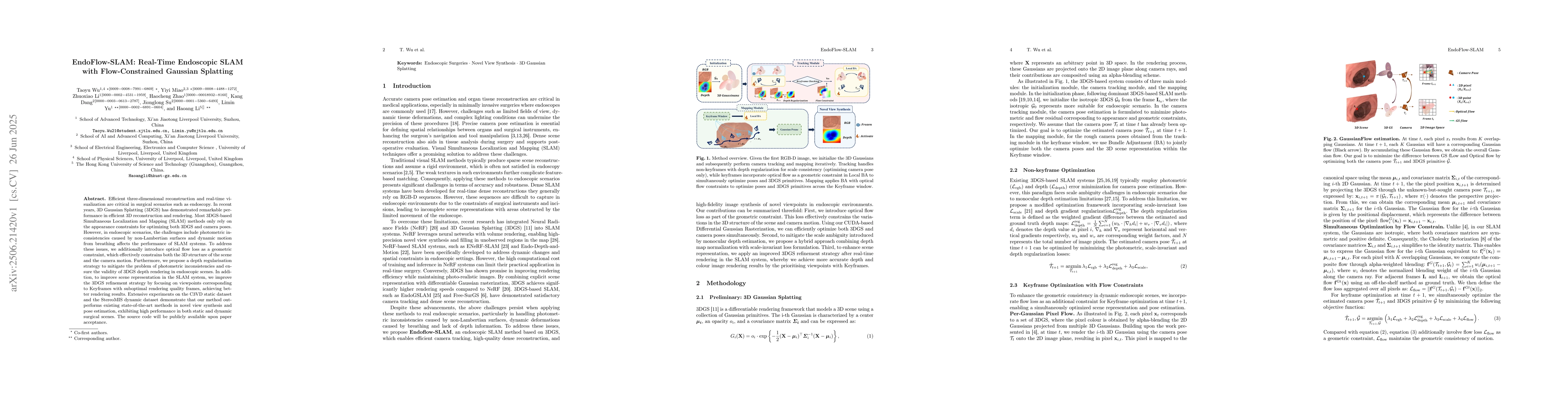 Efficient three-dimensional reconstruction and real-time visualization are critical in surgical scenarios such as endoscopy. In recent years, 3D Gaussian Splatting (3DGS) has demonstrated remarkable performance in efficient 3D reconstruction and rendering. Most 3DGS-based Simultaneous Localization and Mapping (SLAM) methods only rely on the appearance constraints for optimizing both 3DGS and camera poses. However, in endoscopic scenarios, the challenges include photometric inconsistencies caused by non-Lambertian surfaces and dynamic motion from breathing affects the performance of SLAM systems. To address these issues, we additionally introduce optical flow loss as a geometric constraint, which effectively constrains both the 3D structure of the scene and the camera motion. Furthermore, we propose a depth regularisation strategy to mitigate the problem of photometric inconsistencies and ensure the validity of 3DGS depth rendering in endoscopic scenes. In addition, to improve scene representation in the SLAM system, we improve the 3DGS refinement strategy by focusing on viewpoints corresponding to Keyframes with suboptimal rendering quality frames, achieving better rendering results. Extensive experiments on the C3VD static dataset and the StereoMIS dynamic dataset demonstrate that our method outperforms existing state-of-the-art methods in novel view synthesis and pose estimation, exhibiting high performance in both static and dynamic surgical scenes. The source code will be publicly available upon paper acceptance.
