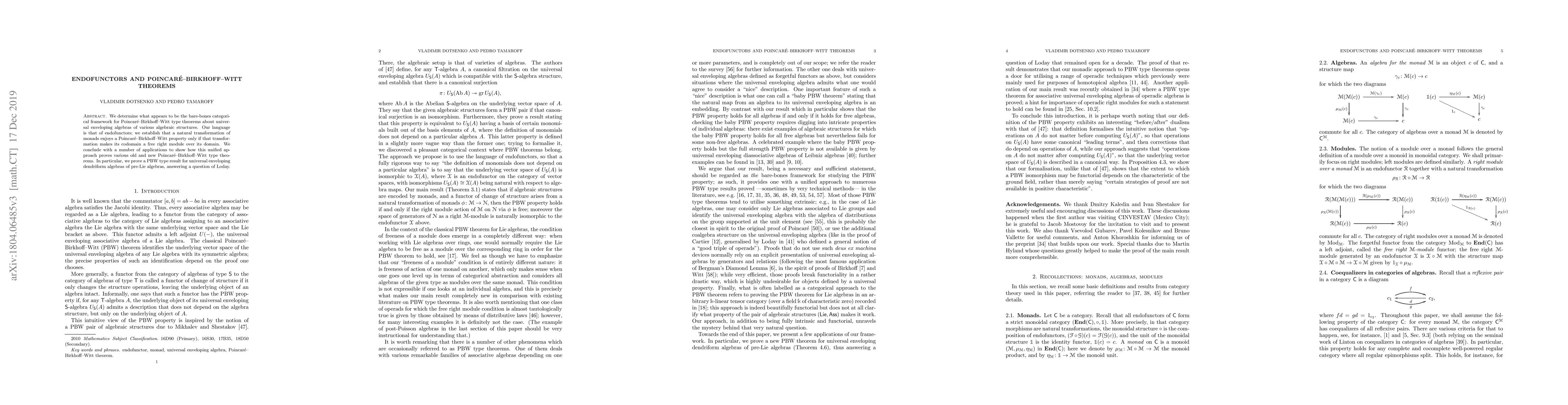 This paper establishes a categorical framework using endofunctors to prove Poincaré-Birkhoff-Witt (PBW) theorems for universal enveloping algebras. It shows that natural transformations of monads satisfy PBW properties if they convert the codomain into a free right module over the domain, and applies this approach to derive new PBW results, including for universal enveloping dendriform algebras of pre-Lie algebras.