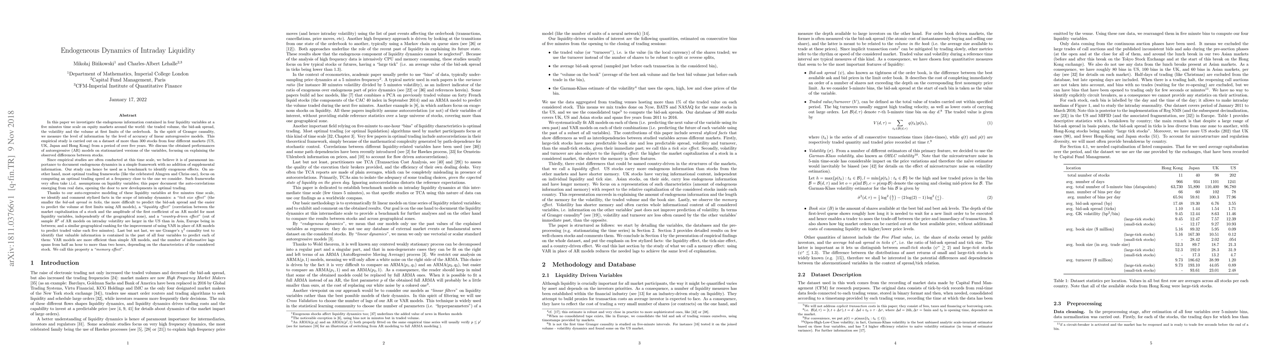 In this paper we investigate the endogenous information contained in four liquidity variables at a five minutes time scale on equity markets around the world: the traded volume, the bid-ask spread, the volatility and the volume at first limits of the orderbook. In the spirit of Granger causality, we measure the level of information by the level of accuracy of linear autoregressive models. This empirical study is carried out on a dataset of more than 300 stocks from four different markets (US, UK, Japan and Hong Kong) from a period of over five years. We discuss the obtained performances of autoregressive (AR) models on stationarized versions of the variables, focusing on explaining the observed differences between stocks. Since empirical studies are often conducted at this time scale, we believe it is of paramount importance to document endogenous dynamics in a simple framework with no addition of supplemental information. Our study can hence be used as a benchmark to identify exogenous effects. On the other hand, most optimal trading frameworks (like the celebrated Almgren and Chriss one), focus on computing an optimal trading speed at a frequency close to the one we consider. Such frameworks very often take i.i.d. assumptions on liquidity variables; this paper document the auto-correlations emerging from real data, opening the door to new developments in optimal trading.