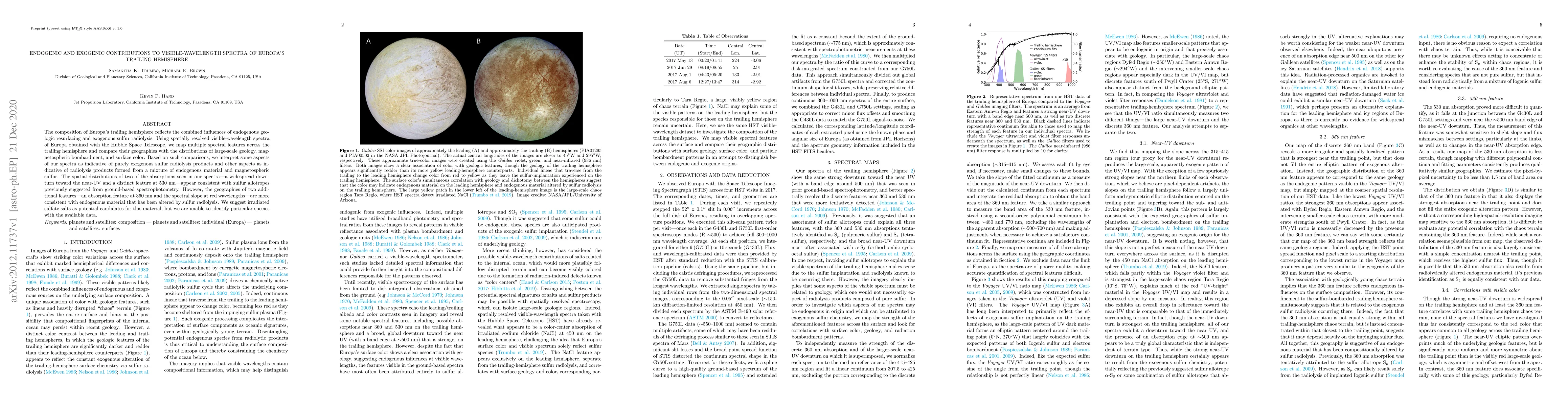 Research on Europa's trailing hemisphere reveals a mix of endogenous geologic resurfacing and exogenous sulfur radiolysis contributing to its visible-wavelength spectra.