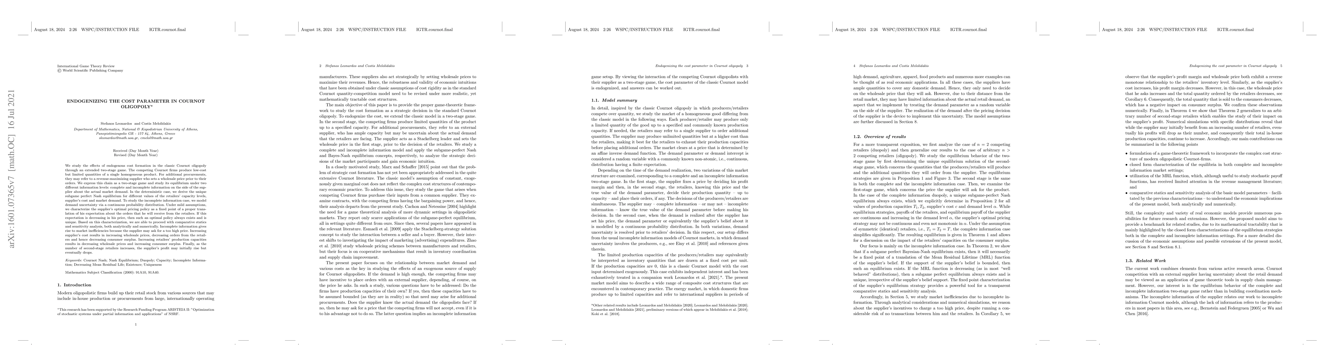 We study the effects of endogenous cost formation in the classic Cournot oligopoly through an extended two-stage game. The competing Cournot firms produce low-cost but limited quantities of a single homogeneous product. For additional procurements, they may refer to a revenue-maximizing supplier who sets a wholesale price prior to their orders. We express this chain as a two-stage game and study its equilibrium under two different information levels: complete and incomplete information on the side of the supplier about the actual market demand. In the deterministic case, we derive the unique subgame perfect Nash equilibrium for different values of the retailers' capacity levels, supplier's cost and market demand. To study the incomplete information case, we model demand uncertainty via a continuous probability distribution. Under mild assumptions, we characterize the supplier's optimal pricing policy as a fixed point of a proper translation of his expectation about the orders that he will receive from the retailers. If this expectation is decreasing in his price, then such an optimal policy always exists and is unique. Based on this characterization, we are able to proceed with comparative statics and sensitivity analysis, both analytically and numerically. Incomplete information gives rise to market inefficiencies because the supplier may ask for a too high price. Increasing supplier's cost results in increasing wholesale prices, decreasing orders from the retailers and hence decreasing consumer surplus. Increasing retailers' production capacities results in decreasing wholesale prices and increasing consumer surplus. Finally, as the number of second-stage retailers increases, the supplier's profit may initially rise but eventually drops.