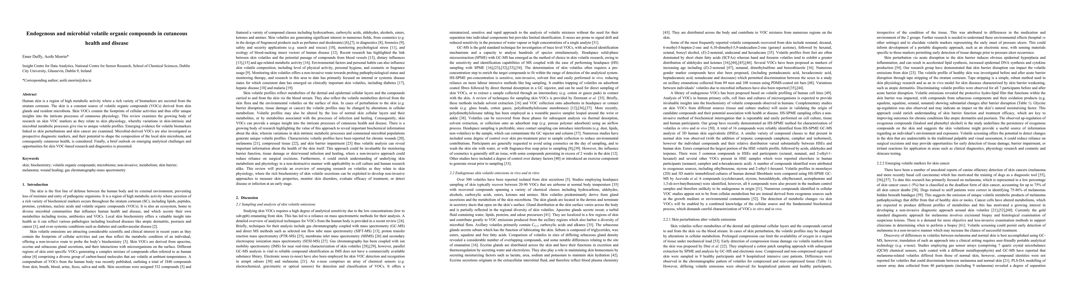 Research on skin volatile organic compounds (VOCs) reveals their potential as biomarkers for cutaneous health and disease, including skin cancer. Analytical challenges and opportunities for VOC-based research and diagnostics are also discussed.