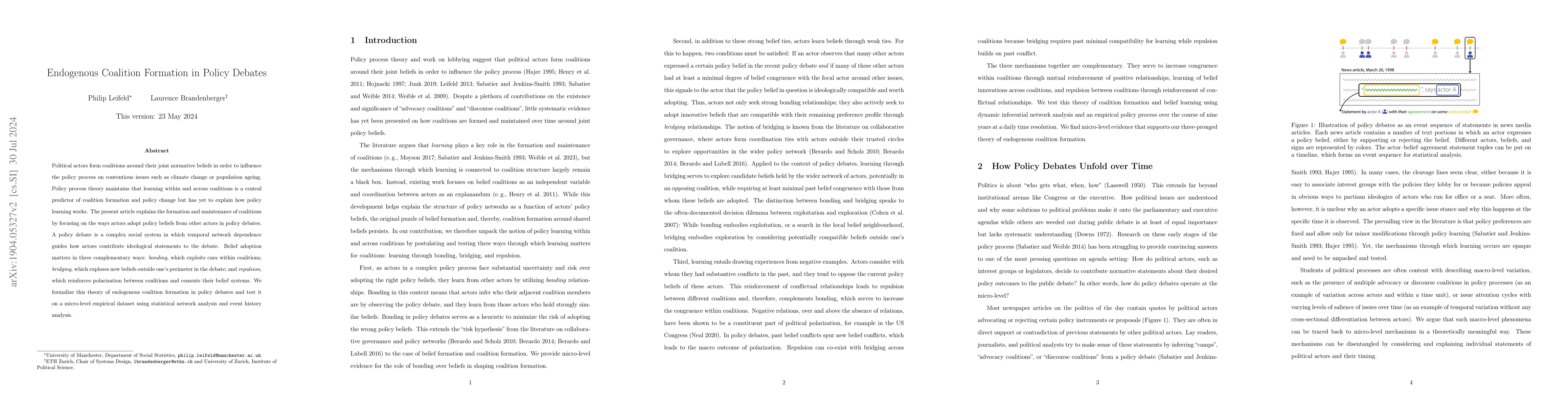 Political actors form coalitions around their joint policy beliefs in order to influence the policy process on contentious issues such as climate change or population aging. The present article explains the formation and maintenance of coalitions by focusing on the ways that actors adopt policy beliefs from other actors. A policy debate is a complex system that exhibits network dependencies both in cross-sectional and longitudinal ways when actors contribute ideological statements to the debate. In such a temporal network, learning of policy beliefs matters in three complementary ways: positive reciprocity through bonding relationships within coalitions, innovation across coalitions through bridging relationships, and negative reciprocity through repulsion, or polarization, of adversarial coalitions by reinforcement of conflictual relationships. We test this theory of endogenous coalition formation in policy debates using a novel inferential technique combining network and event history analysis and find systematic evidence for the interplay of the three coalition formation mechanisms.