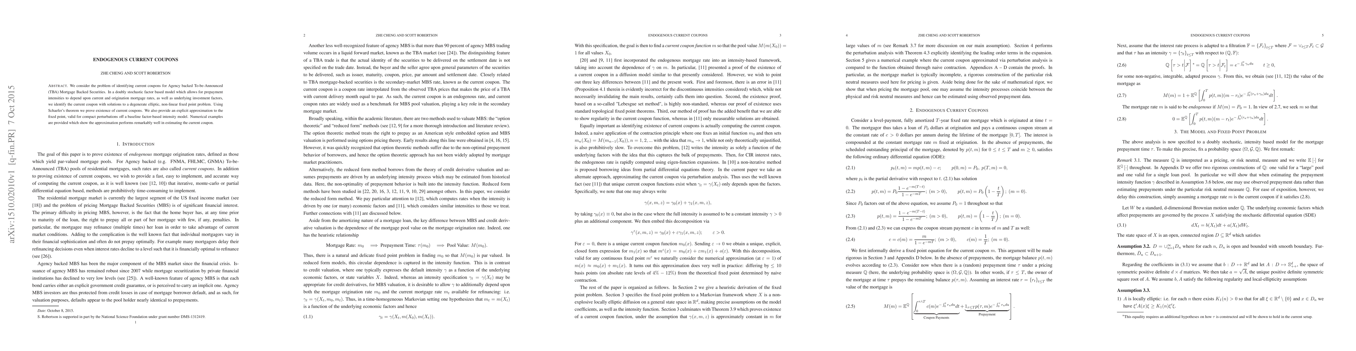 We consider the problem of identifying current coupons for Agency backed To-be-Announced (TBA) Mortgage Backed Securities. In a doubly stochastic factor based model which allows for prepayment intensities to depend upon current and origination mortgage rates, as well as underlying investment factors, we identify the current coupon with solutions to a degenerate elliptic, non-linear fixed point problem. Using Schaefer's theorem we prove existence of current coupons. We also provide an explicit approximation to the fixed point, valid for compact perturbations off a baseline factor-based intensity model. Numerical examples are provided which show the approximation performs remarkably well in estimating the current coupon.