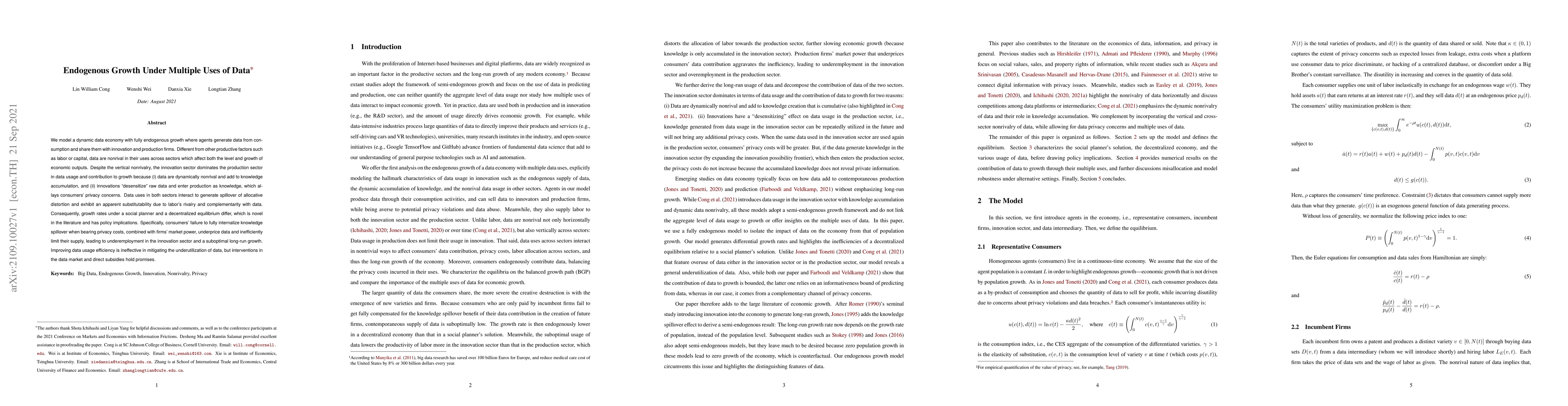 We model a dynamic data economy with fully endogenous growth where agents generate data from consumption and share them with innovation and production firms. Different from other productive factors such as labor or capital, data are nonrival in their uses across sectors which affect both the level and growth of economic outputs. Despite the vertical nonrivalry, the innovation sector dominates the production sector in data usage and contribution to growth because (i) data are dynamically nonrival and add to knowledge accumulation, and (ii) innovations "desensitize" raw data and enter production as knowledge, which allays consumers' privacy concerns. Data uses in both sectors interact to generate spillover of allocative distortion and exhibit an apparent substitutability due to labor's rivalry and complementarity with data. Consequently, growth rates under a social planner and a decentralized equilibrium differ, which is novel in the literature and has policy implications. Specifically, consumers' failure to fully internalize knowledge spillover when bearing privacy costs, combined with firms' market power, underprice data and inefficiently limit their supply, leading to underemployment in the innovation sector and a suboptimal long-run growth. Improving data usage efficiency is ineffective in mitigating the underutilization of data, but interventions in the data market and direct subsidies hold promises.