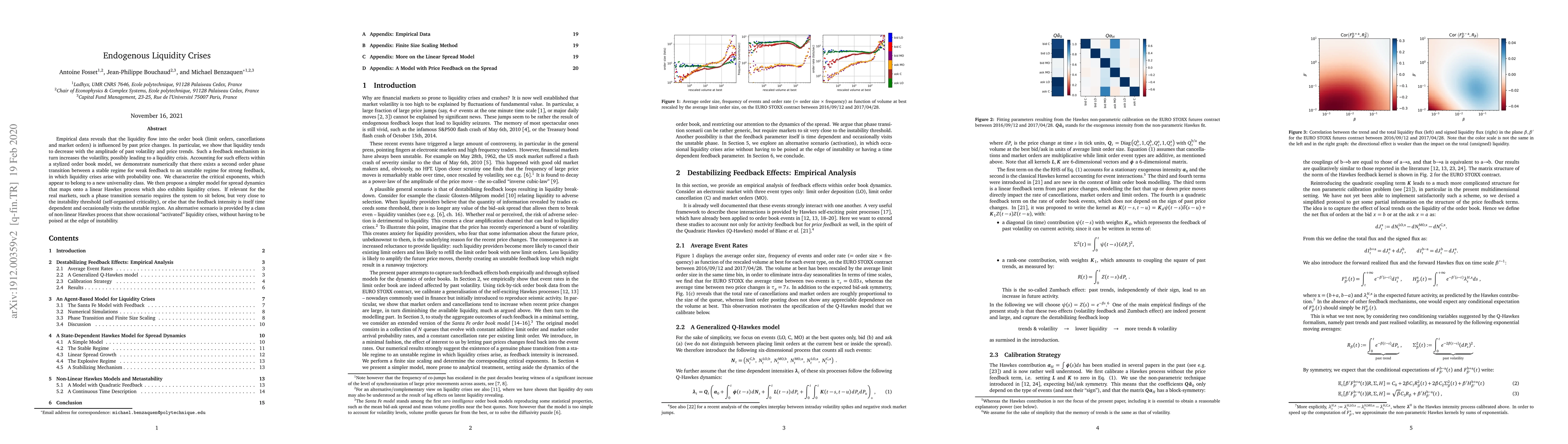 Empirical data reveals that the liquidity flow into the order book (depositions, cancellations andmarket orders) is influenced by past price changes. In particular, we show that liquidity tends todecrease with the amplitude of past volatility and price trends. Such a feedback mechanism inturn increases the volatility, possibly leading to a liquidity crisis. Accounting for such effects withina stylized order book model, we demonstrate numerically that there exists a second order phasetransition between a stable regime for weak feedback to an unstable regime for strong feedback,in which liquidity crises arise with probability one. We characterize the critical exponents, whichappear to belong to a new universality class. We then propose a simpler model for spread dynamicsthat maps onto a linear Hawkes process which also exhibits liquidity crises. If relevant for thereal markets, such a phase transition scenario requires the system to sit below, but very close tothe instability threshold (self-organised criticality), or else that the feedback intensity is itself timedependent and occasionally visits the unstable region. An alternative scenario is provided by a classof non-linear Hawkes process that show occasional "activated" liquidity crises, without having to bepoised at the edge of instability.