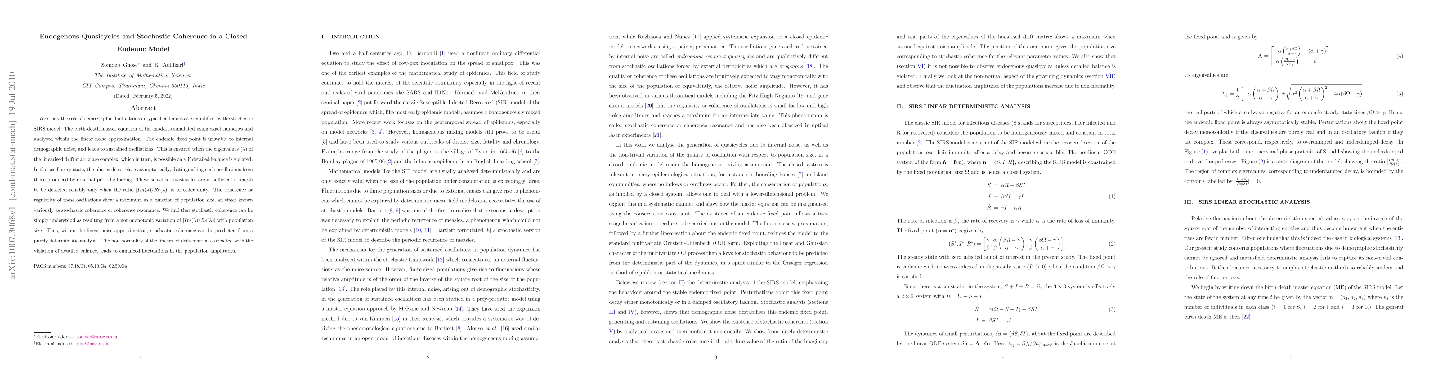 We study the role of demographic fluctuations in typical endemics as exemplified by the stochastic SIRS model. The birth-death master equation of the model is simulated using exact numerics and analysed within the linear noise approximation. The endemic fixed point is unstable to internal demographic noise, and leads to sustained oscillations. This is ensured when the eigenvalues ($\lambda$) of the linearised drift matrix are complex, which in turn, is possible only if detailed balance is violated. In the oscillatory state, the phases decorrelate asymptotically, distinguishing such oscillations from those produced by external periodic forcing. These so-called quasicycles are of sufficient strength to be detected reliably only when the ratio $|Im(\lambda)/Re(\lambda)|$ is of order unity. The coherence or regularity of these oscillations show a maximum as a function of population size, an effect known variously as stochastic coherence or coherence resonance. We find that stochastic coherence can be simply understood as resulting from a non-monotonic variation of $|Im(\lambda)/Re(\lambda)|$ with population size. Thus, within the linear noise approximation, stochastic coherence can be predicted from a purely deterministic analysis. The non-normality of the linearised drift matrix, associated with the violation of detailed balance, leads to enhanced fluctuations in the population amplitudes.