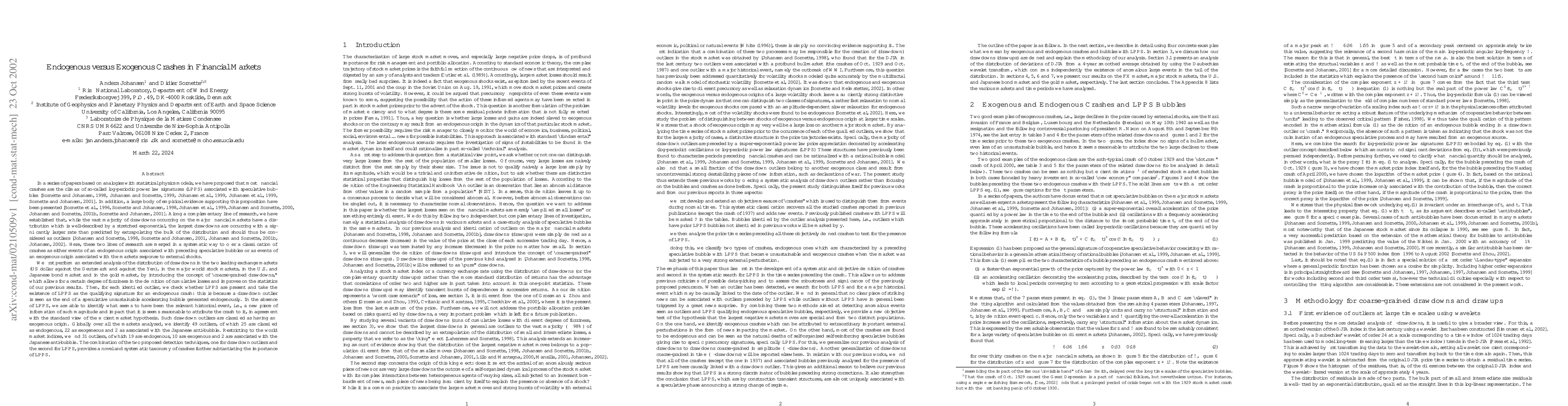 This paper identifies 49 market crashes across various financial markets, classifying 25 as endogenous (due to internal bubble bursts) and 22 as exogenous (due to external events), with a novel taxonomy using log-periodic power law signatures.
