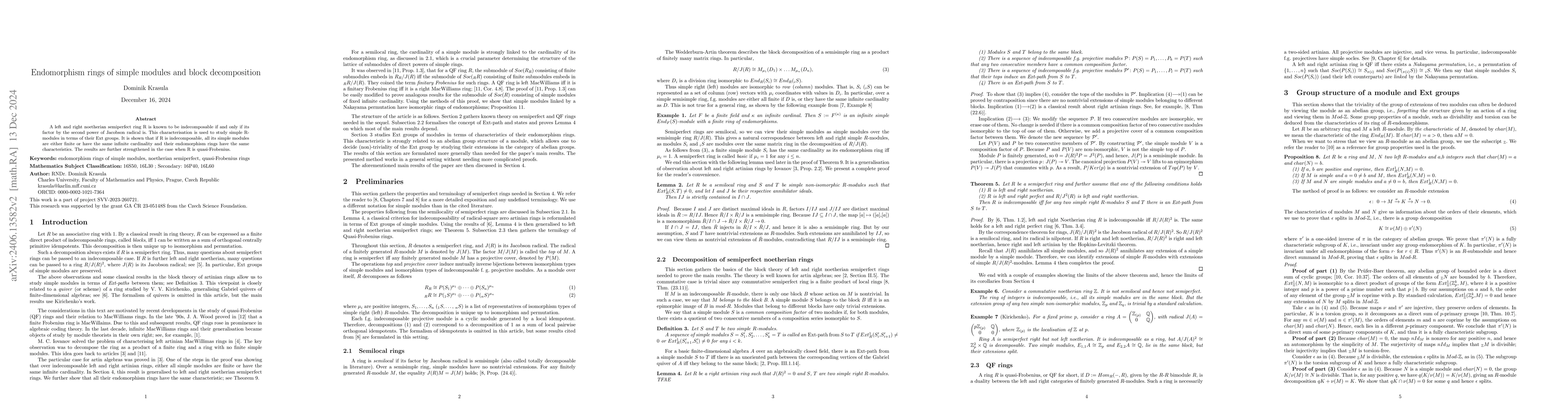 A left and right noetherian semiperfect ring R is known to be indecomposable if and only if its factor by the second power of Jacobson radical is. This characterisation is used to study simple R-modules in terms of their Ext groups. It is shown that if R is indecomposable, all its simple modules are either finite or have the same infinite cardinality and their endomorphism rings have the same characteristics. The results are further strengthened in the case when R is quasi-Frobenius.