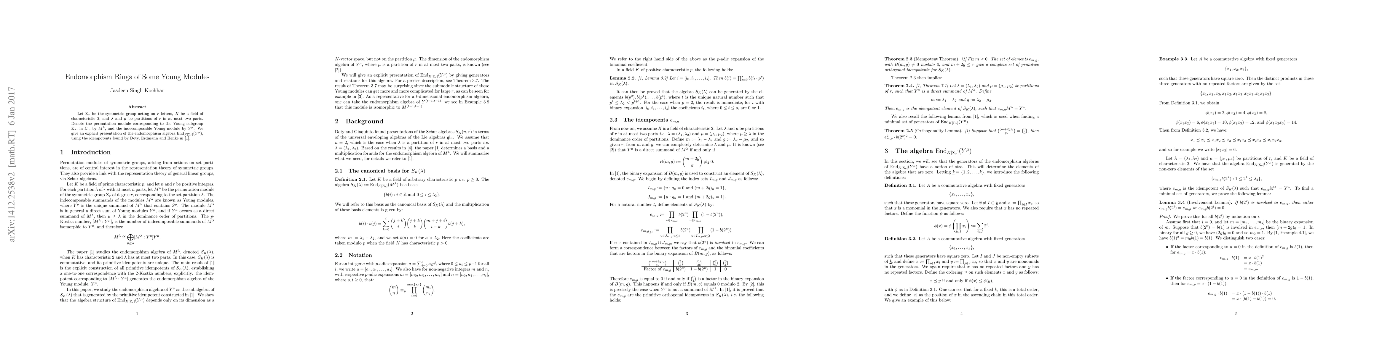 Let $\Sigma_r$ be the symmetric group acting on $r$ letters, $K$ be a field of characteristic 2 and $\lambda$ and $\mu$ be partitions of $r$ in at most two parts. Denote the permutation module corresponding to the Young subgroup $\Sigma_\lambda$ in $\Sigma_r$ by $M^\lambda$, and the indecomposable Young module by $Y^\mu$. We give an explicit presentation of the endomorphism algebra ${\rm End}_{K[\Sigma_r]}(Y^\mu)$, using the idempotents found by Doty, Erdmann and Henke in [1].