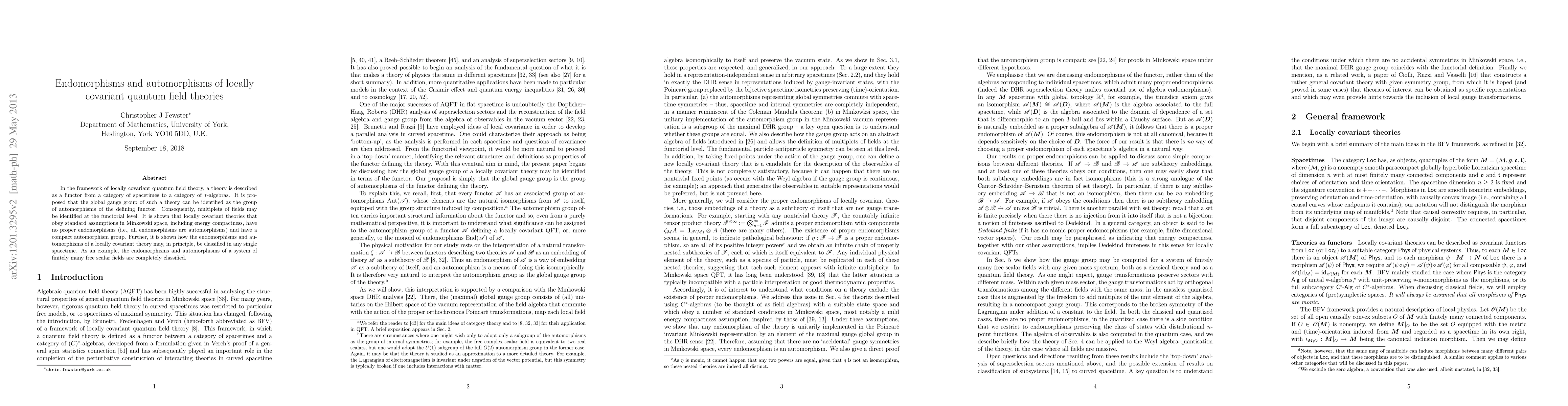 This paper examines the structure of automorphisms and endomorphisms in locally covariant quantum field theories, identifying the global gauge group as the automorphisms of the defining functor. It demonstrates that under standard assumptions, such theories lack proper endomorphisms and have a compact automorphism group, with examples classified in Minkowski space.