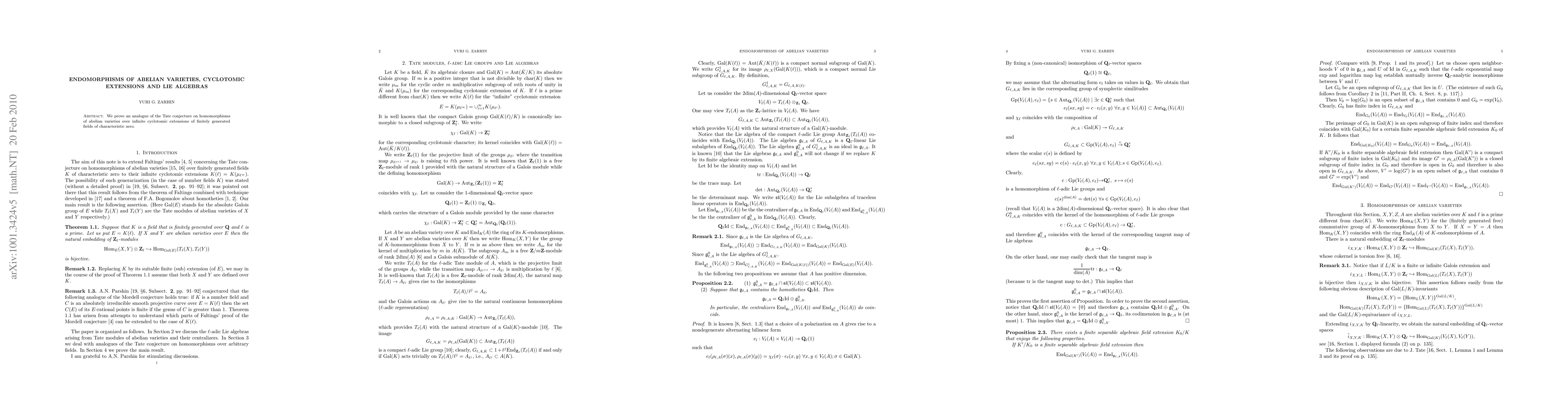 Summary: This paper proves an analogue of the Tate conjecture for abelian varieties over infinite cyclotomic extensions of finitely generated fields in characteristic zero, linking endomorphisms to Lie algebras.