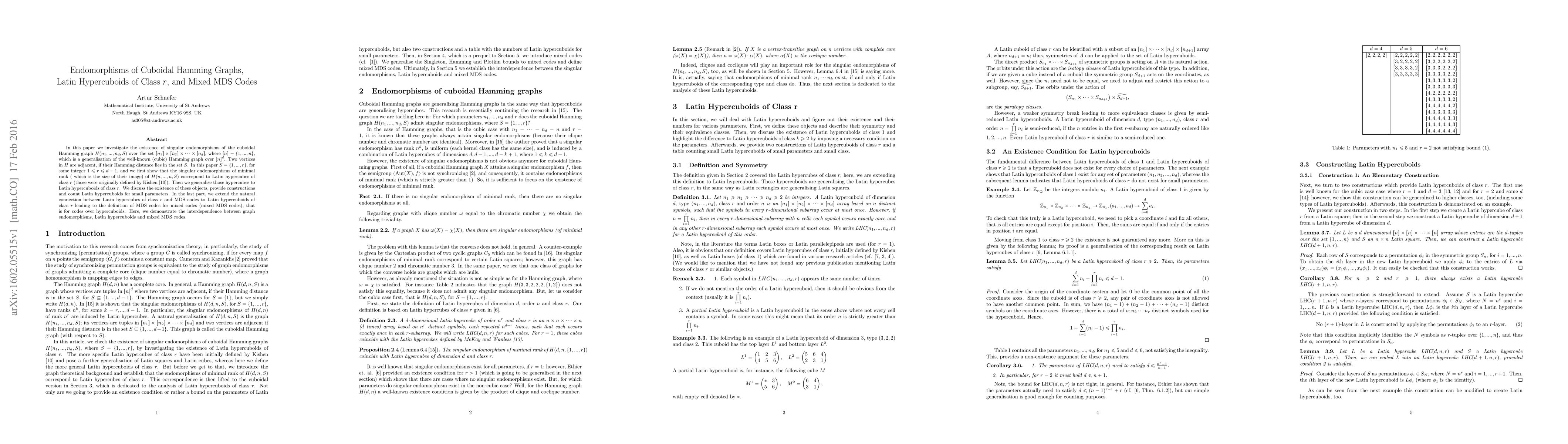 In this paper we investigate the existence of singular endomorphisms of the cuboidal Hamming graph $H(n_1,...,n_d,S)$ over the set $\left[ n_1\right]\times \left[ n_2\right]\times \cdots \times \left[ n_d\right]$, where $\left[ n\right]=\{1,...,n\}$, which is a generalisation of the well-known (cubic) Hamming graph over $\left[ n\right]^{d}$. Two vertices in $H$ are adjacent, if their Hamming distance lies in the set $S$. In this paper $S=\{1,...,r\}$, for some integer $1\leq r\leq d-1$, and we first show that the singular endomorphisms of minimal rank ( which is the size of their image) of $H(n,...,n,S)$ correspond to Latin hypercubes of class $r$ (those were originally defined by Kishen (1950)). Then we generalise those hypercubes to Latin hypercuboids of class $r$. We discuss the existence of these objects, provide constructions and count Latin hypercuboids for small parameters. In the last part, we extend the natural connection between Latin hypercubes of class $r$ and MDS codes to Latin hypercuboids of class $r$ leading to the definition of MDS codes for mixed codes (mixed MDS codes), that is for codes over hypercuboids. Here, we demonstrate the interdependence between graph endomorphisms, Latin hypercuboids and mixed MDS codes.
