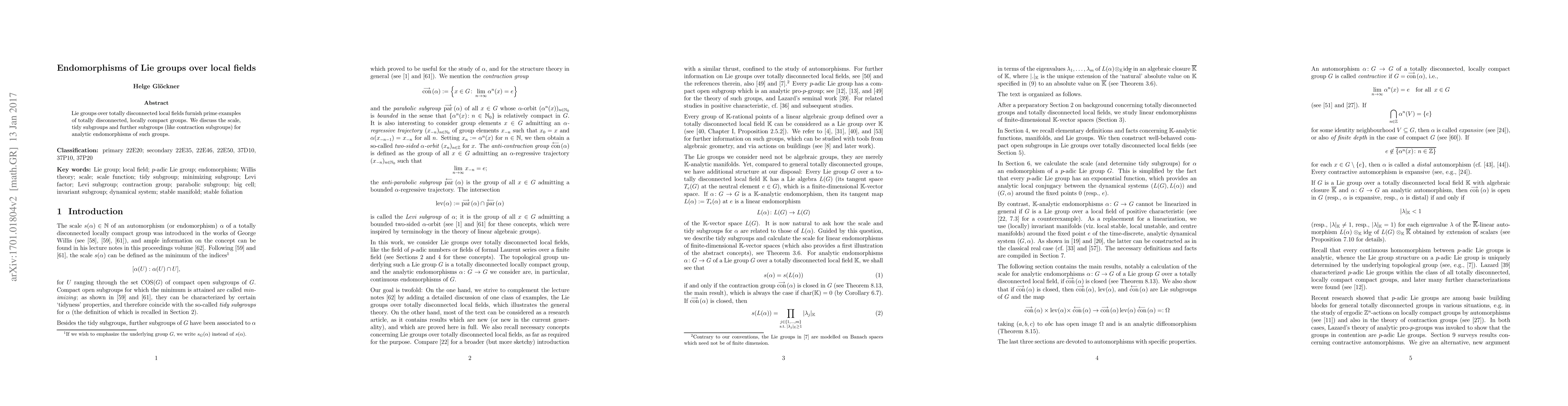 Lie groups over local fields furnish prime examples of totally disconnected, locally compact groups. We discuss the scale, tidy subgroups and further subgroups (like contraction subgroups) for analytic endomorphisms of such groups. The text is both a research article and a worked out set of lecture notes for a mini-course held June 27-July 1, 2016 at the MATRIX research center in Creswick (Australia) as part of the "Winter of Disconnectedness". The text can be read in parallel to the earlier lecture notes arXiv:0804.2234 which are devoted to automorphisms, with sketches of proof. Complementary aspects are emphasized.