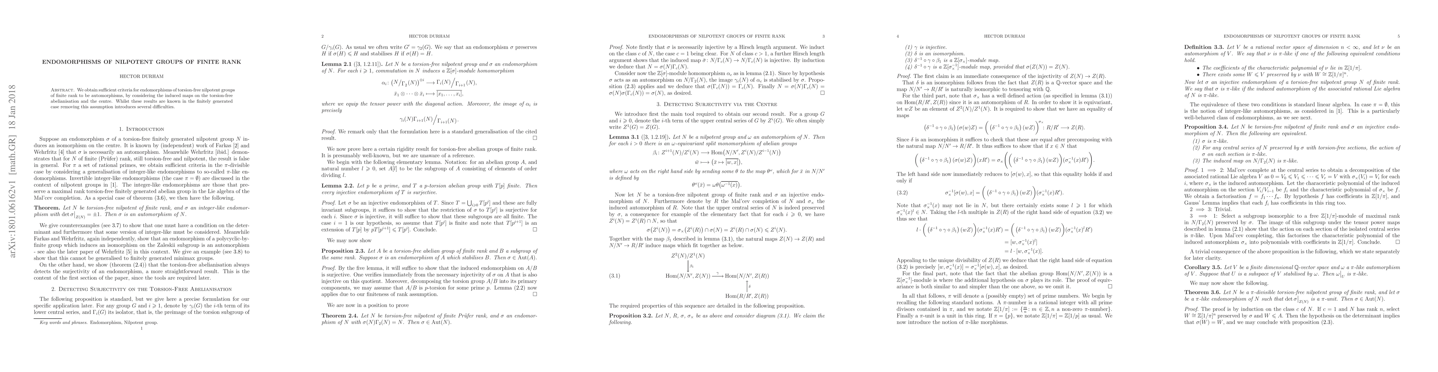 Researchers developed criteria for determining if endomorphisms of nilpotent groups with finite rank are automorphisms, focusing on torsion-free abelianisation and centre, with implications for finitely generated groups.