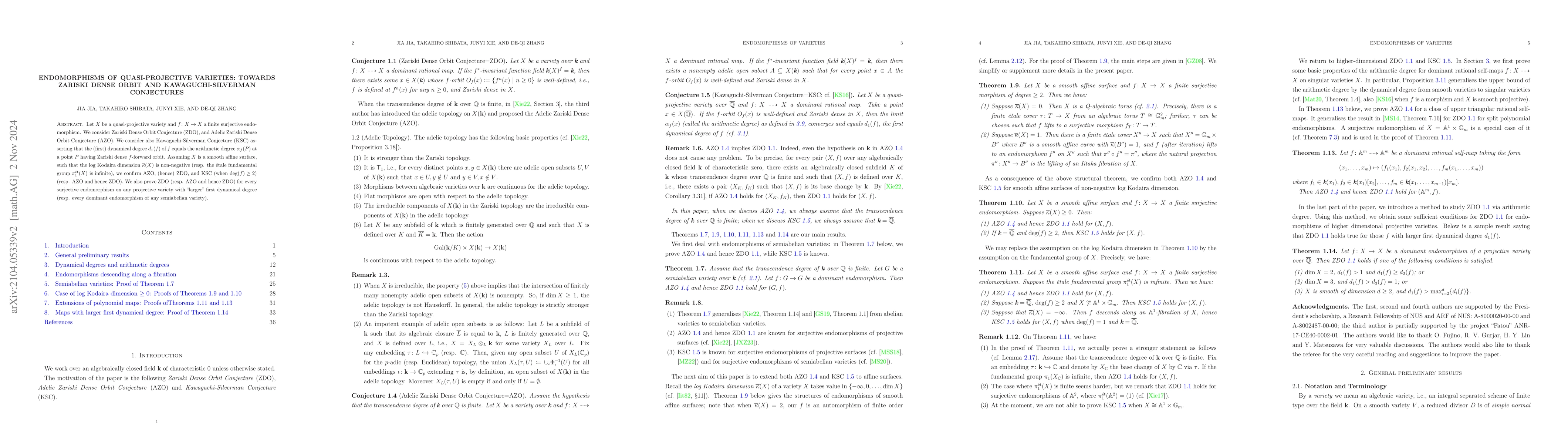This paper studies endomorphisms of quasi-projective varieties, confirming the Zariski Dense Orbit Conjecture (ZDO) and Kawaguchi-Silverman Conjecture (KSC) under certain conditions on smooth affine surfaces and projective varieties. Specifically, it verifies these conjectures when the endomorphism degree is sufficiently large or when the variety has specific geometric properties.