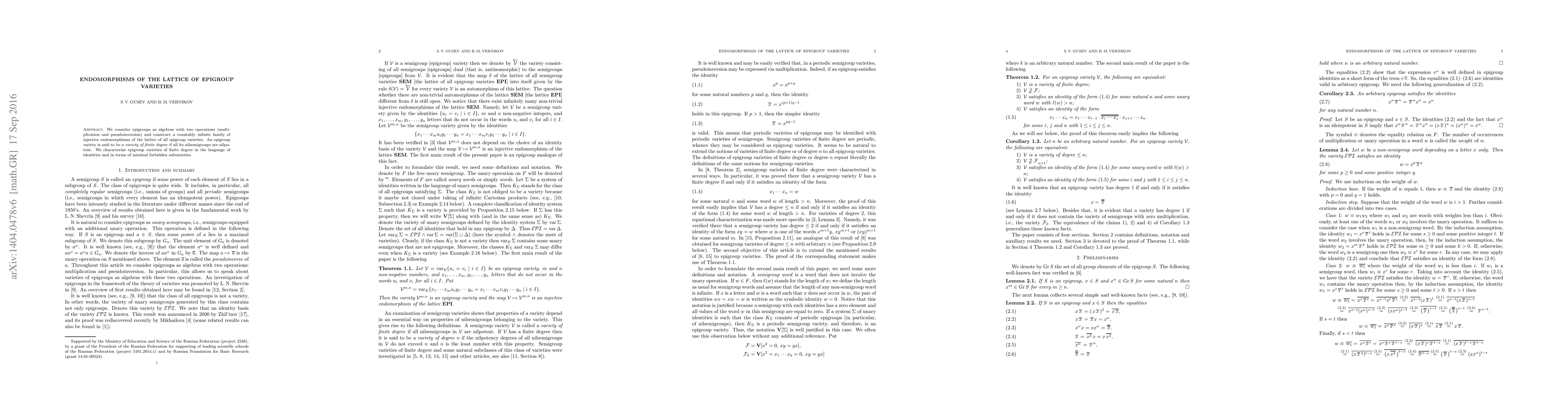 We examine varieties of epigroups as unary semigroups, that is semigroups equipped with an additional unary operation of pseudoinversion. The article contains two main results. The first of them indicates a countably infinite family of injective endomorphisms of the lattice of all epigroup varieties. An epigroup variety is said to be a variety of finite degree if all its nilsemigroups are nilpotent. The second result of the article provides a characterization of epigroup varieties of finite degree in a language of identities and in terms of minimal forbidden subvarieties. Note that the first result is essentially used in the proof of the second one.