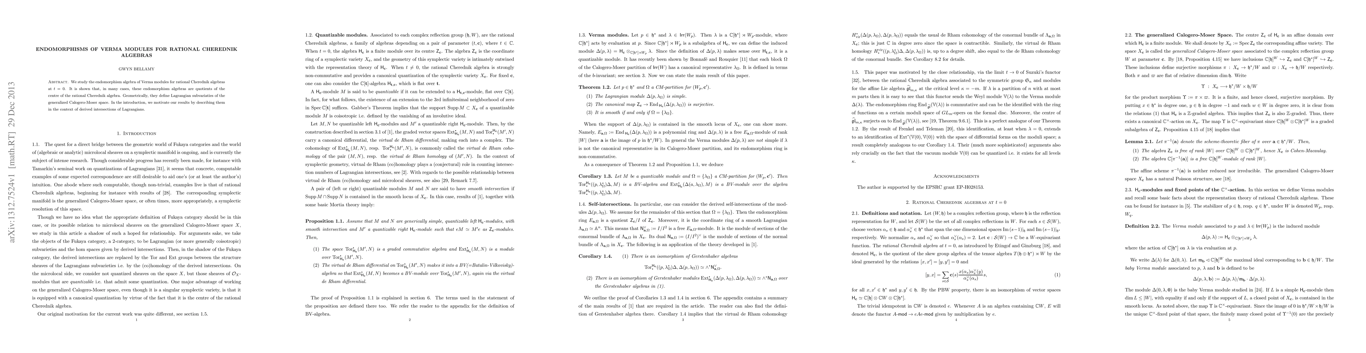 We study the endomorphism algebra of Verma modules for rational Cherednik algebras at t=0. It is shown that, in many cases, these endomorphism algebras are quotients of the centre of the rational Cherednik algebra. Geometrically, they define Lagrangian subvariaties of the generalized Calogero-Moser space. In the introduction, we motivate our results by describing them in the context of derived intersections of Lagrangians.